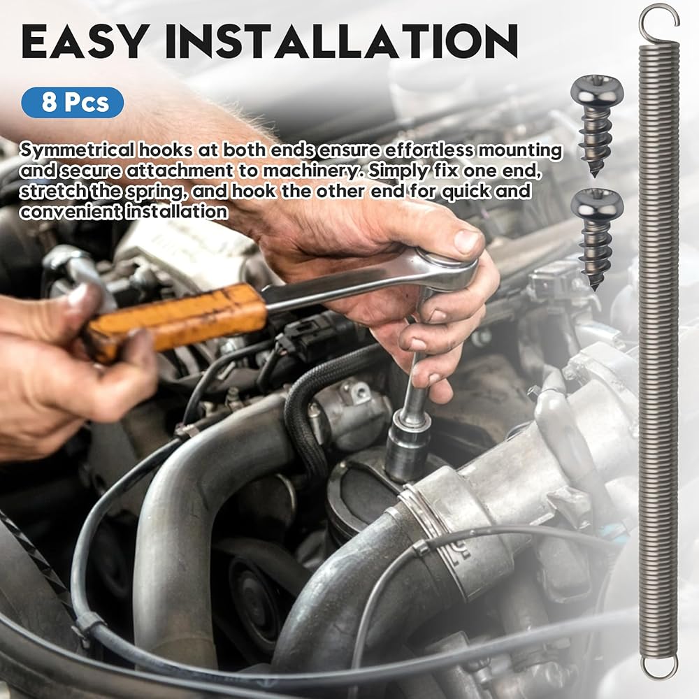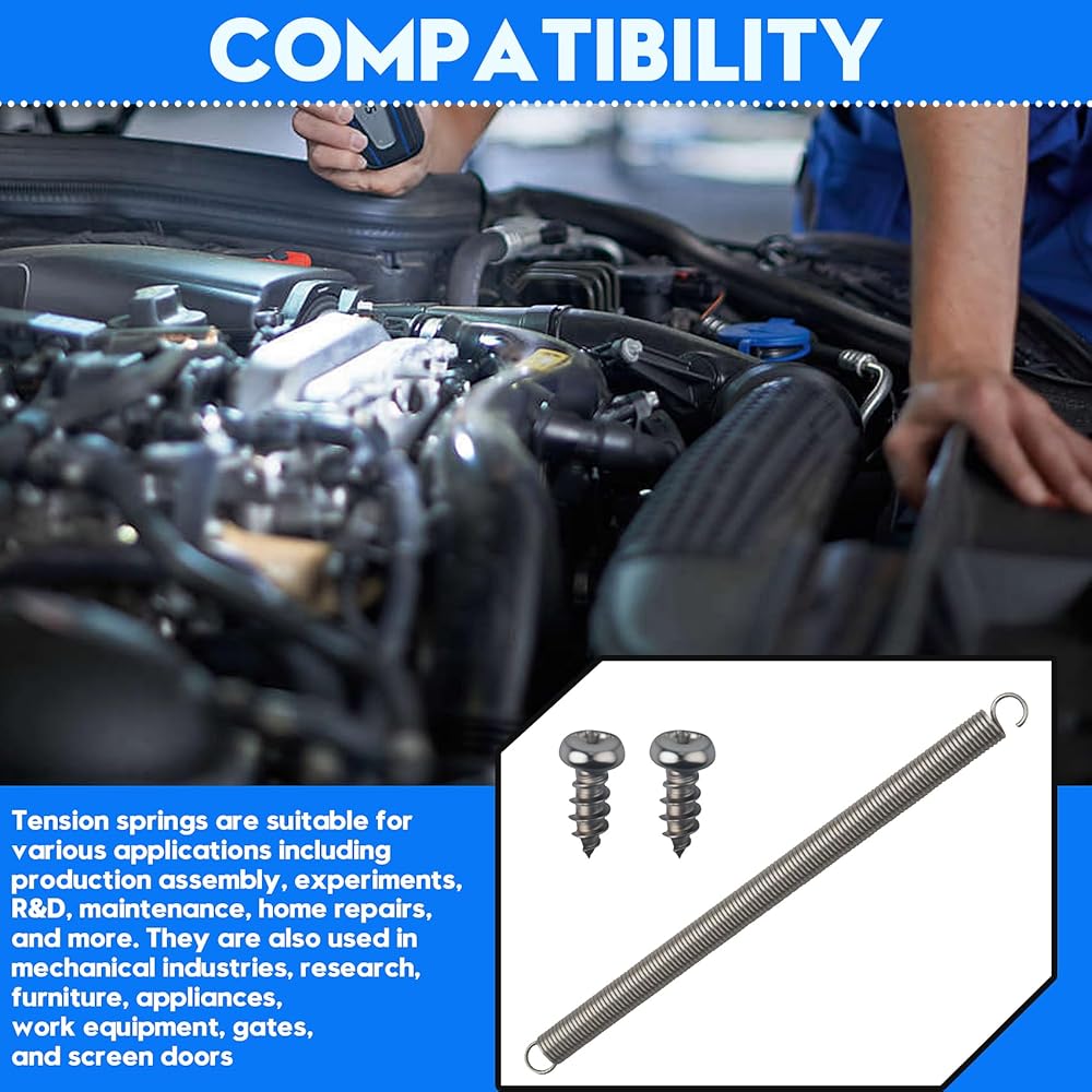Compatibility: Tension springs are suitable for various applications including production assembly, experiments, R&D, maintenance, home repairs, and more. They are also used in mechanical industries, research, furniture, appliances, work equipment, gates, and screen doors