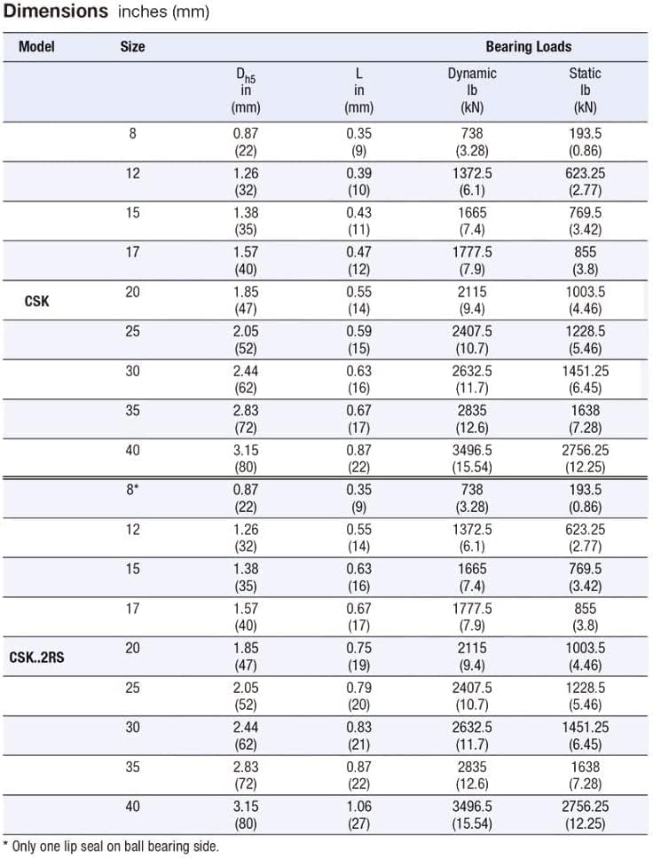 Type CSK is a sprag type clutch integrated into a 62 Series ball bearing (except sizes 8 and 40). It is bearing supported, shipped grease lubricated and protected against dust larger than .012"(.3mm) diameter. The use of additional "nylon" type seals is recommended especially when the working temperature exceeds 122°F (50°C).