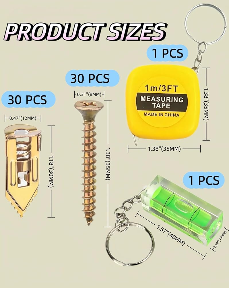 All-in-One Installation Kit: Includes 62 pcs metal expansion anchors with matching screws, a 3ft retractable tape measure, and a mini bubble level for precise, hassle-free mounting without extra tools required