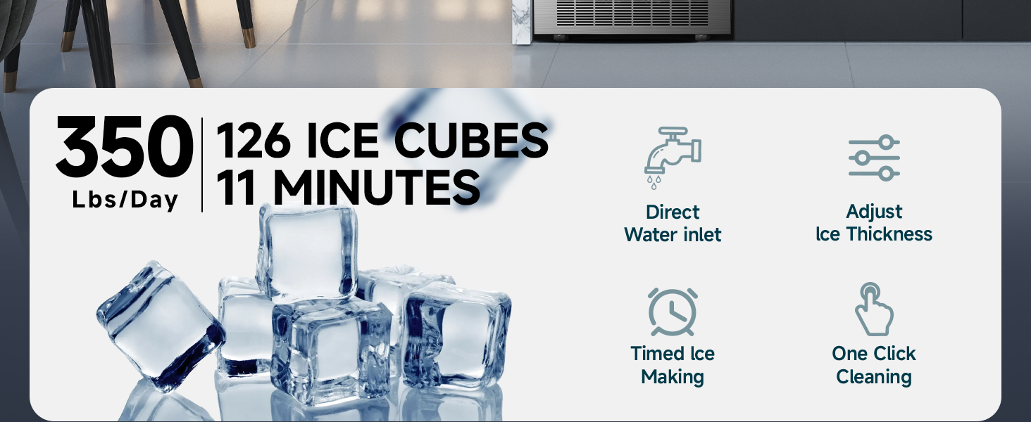 Ultra-High Efficiency&Ice Output: Our commercial ice maker machine can produces 350 lbs ice per day , with 126 clear ice cubes ready in just 10-12 minutes, you will have no worry about running out of ice again even during peak hours, meanwhile, the ice maker also has a storage container for 44 lbs of ice and the thickness of our ice machine can also be adjusted for different drinks, like cocktails, beverages, coffee and more, especiallly ideal for home, bars, restaurants, cafe, hotels and other occasions for using ice.