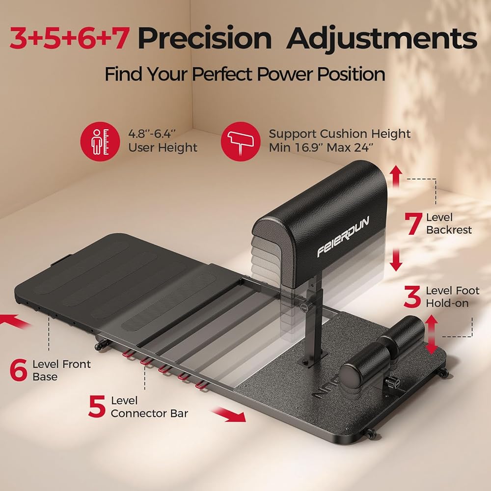 【Fully Adjustable Fit System】A 3-level foot hold-on keeps your feet secure, while 6 front base positions, 5 connector rod settings, and 7 backrest heights let users of all sizes find a suitable setup. Spring-loaded pins lock firmly in place, keeping every adjustment secure and your form consistent rep after rep