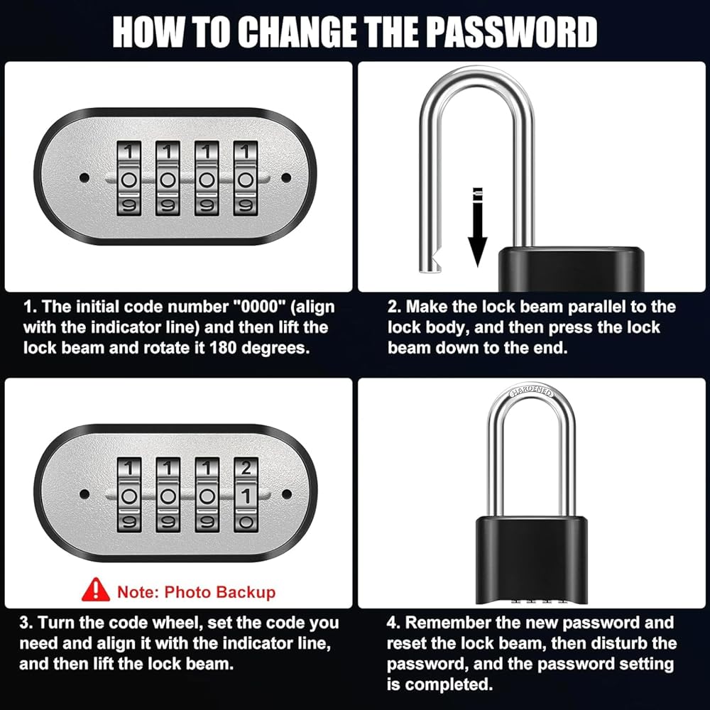 【4 Digit Combinations】The 4-digit combination lock offers 10,000 unique combinations for greater security. Allows you to set your own combination without any additional tools or accessories (Tip: Be sure to back up every time you change your password, forgetting your password means you can't unlock or reset it.)
