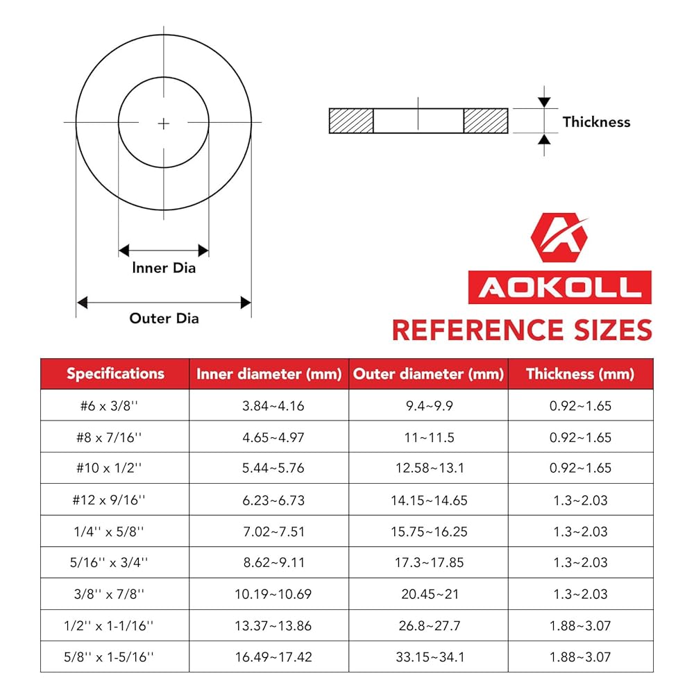 AOKOLL washers are typically manufactured with tight tolerances to ensure a consistent fit and performance, providing reliable spacing and load distribution in assemblies.