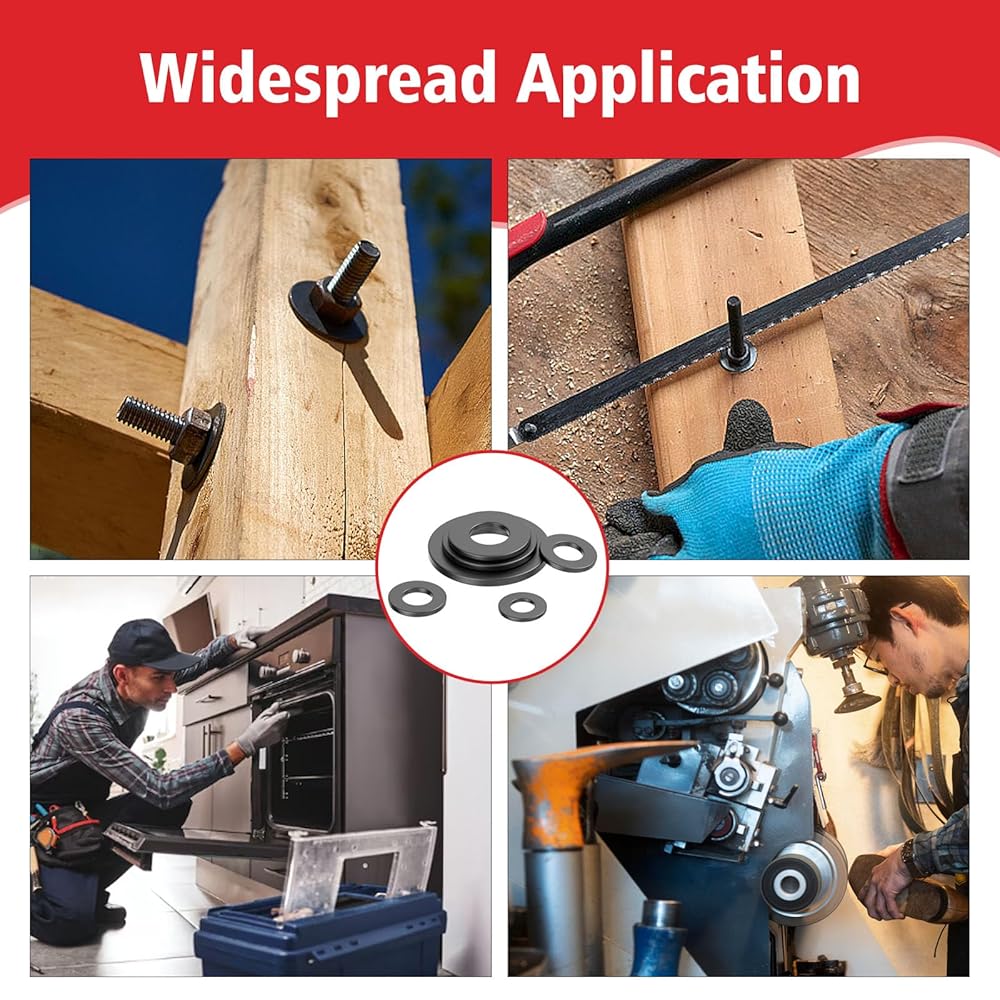 Versatility: These black flat washers are universal, meaning they can be used in a wide range of applications, including construction, automotive, plumbing, and machinery, to evenly distribute load and reduce wear on fasteners.