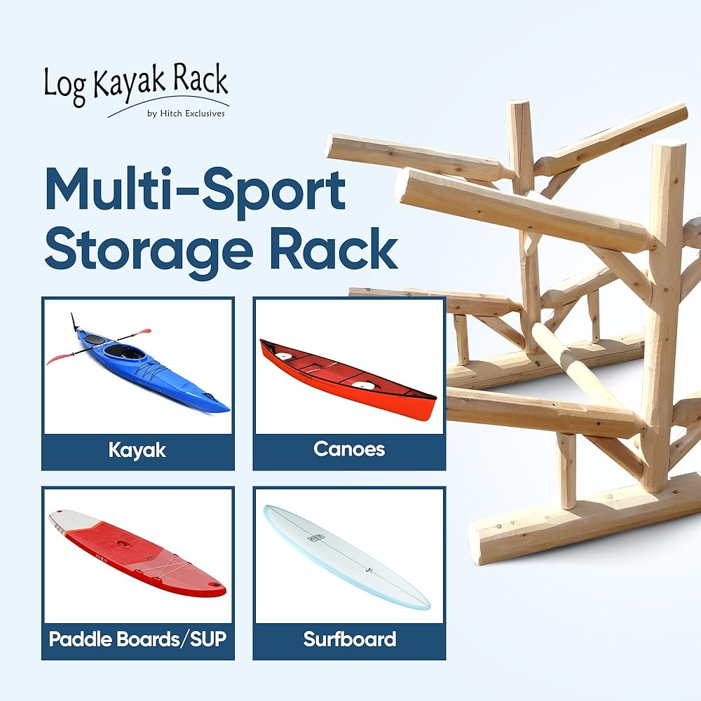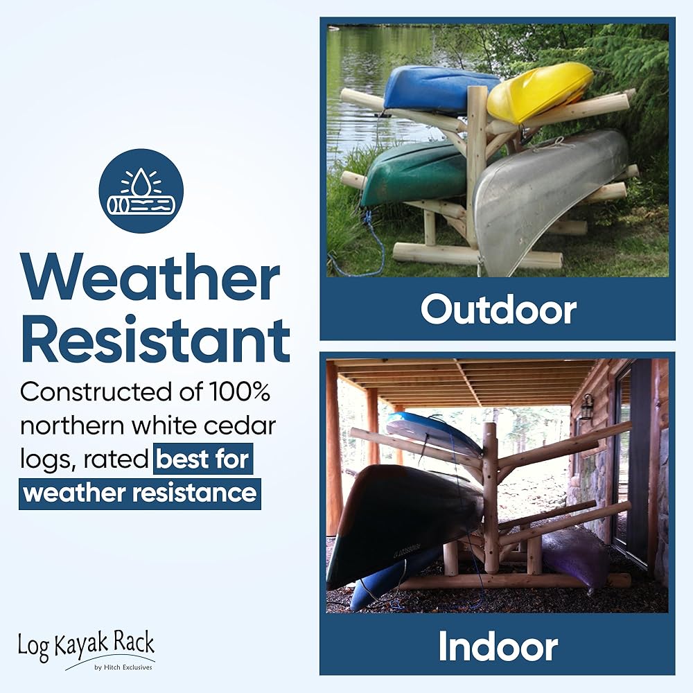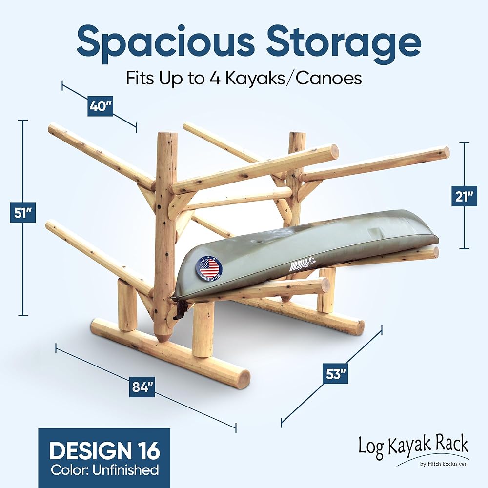 PREMIUM CRAFTSMANSHIP: Crafted with 100% Northern White Cedar from Michigan's Upper Peninsula, this freestanding kayak rack is both functional and visually appealing. Handcrafted by skilled artisans in Northern Wisconsin, each joint is meticulously glued and screwed using mortise and tenon joinery for enhanced durability. With a capacity to hold up to 4 watercrafts, including canoes, surfboards, kayaks, & SUPs, each slot can support up to 100 pounds, totaling an impressive 600 pounds overall.