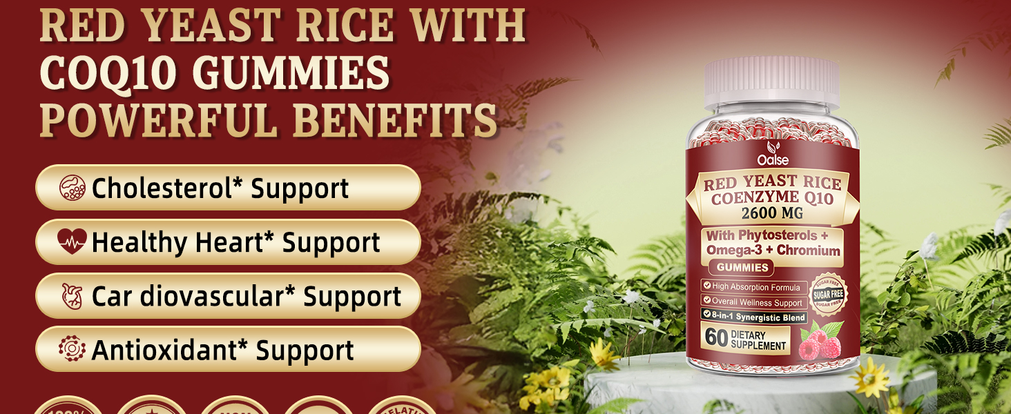 Exclusive Formula & Synergistic Effect: CoQ10 gummies not only contain red yeast rice and Coenzyme Q10, but also include phytosterols, omega-3, aged black garlic and chromium. The combination of red yeast rice and phytosterols supports healthy circulation* via "source reduction" and "external blockage" . When combined with omega-3, they support healthy lipid metabolism* and improve overall blood health