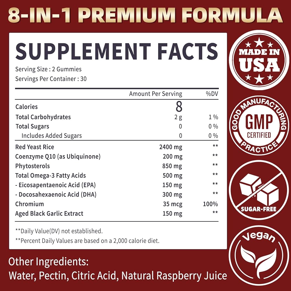 Red Yeast Rice with CoQ10 Gummies,2400mg Red Rice Yeast for Cholesterol*, CoQ10 200mg with Phytosterols, Omega - 3 & Chromium,- 60 Count, Raspberry Flavor for Women & Men