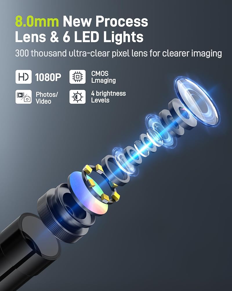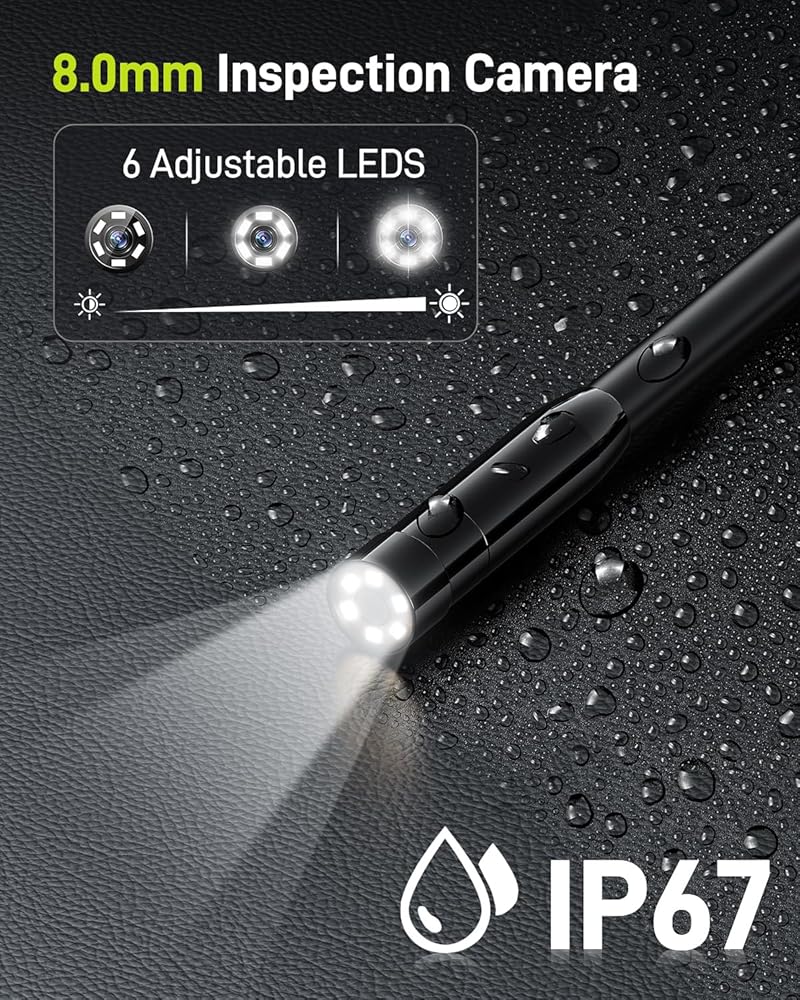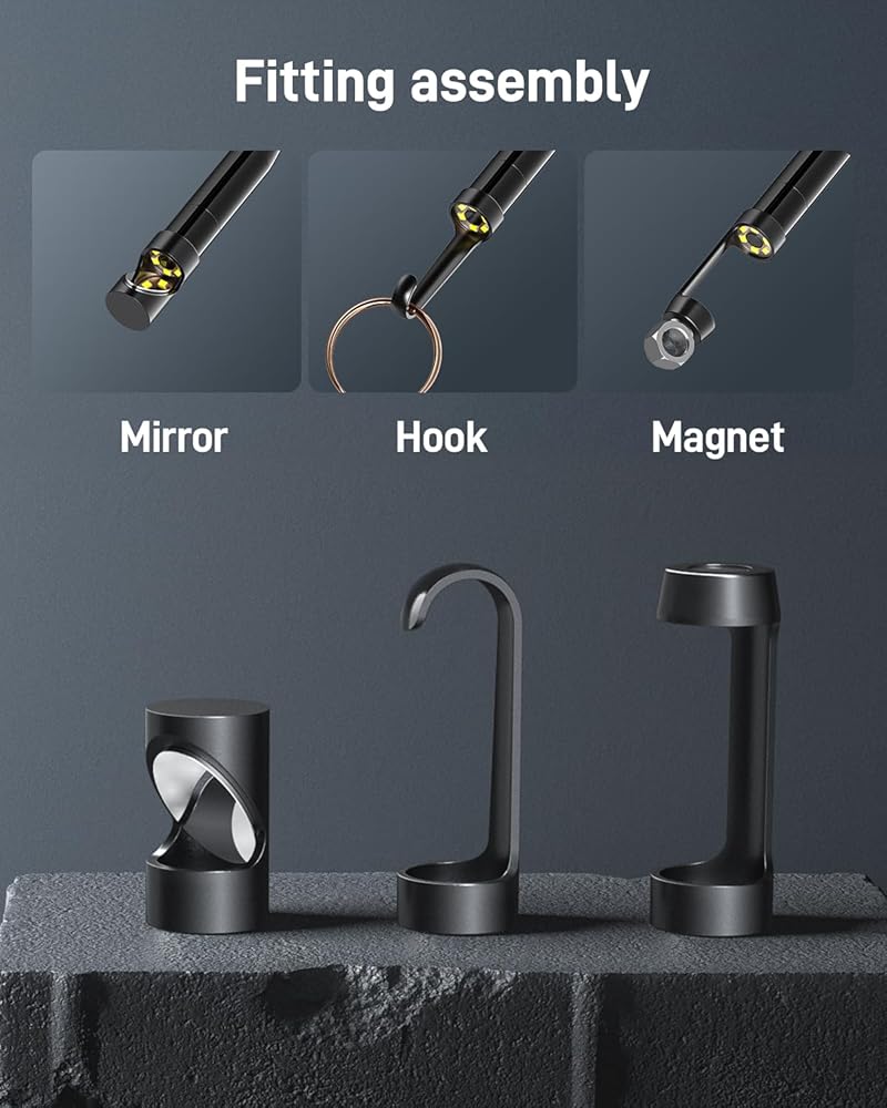 Versatile snake camera - This camera features a 180° rotating function and a 1.2-3.1" focal range. The included hook and magnet help retrieve hard-to-reach objects. IP67 waterproof and 3 adjustable brightness levels ensure clear images even in low light