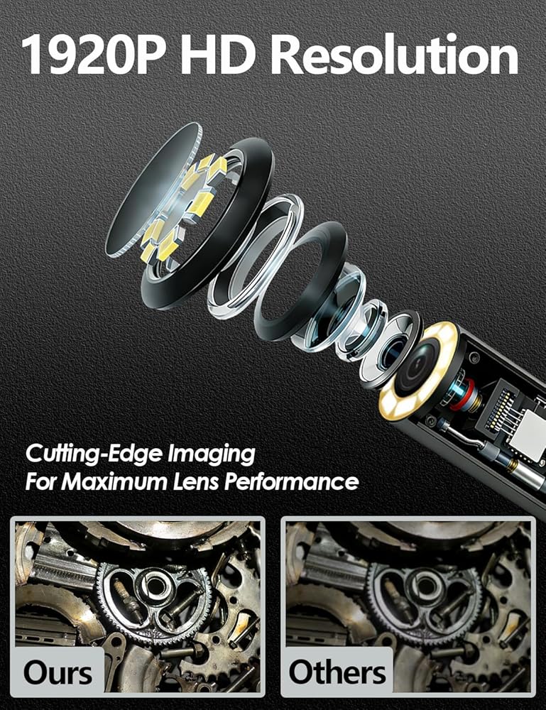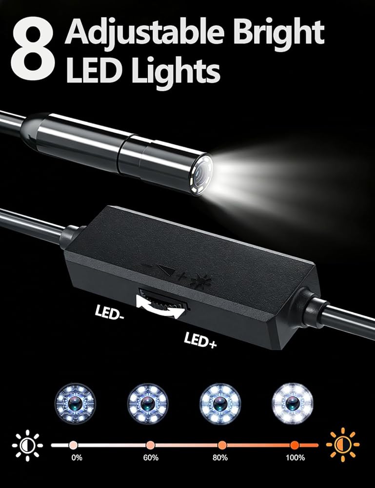 【1920P HD Resolution + 8 Adjustable LEDs】 The built-in high-sensitivity camera captures crisp 1920P full HD images and videos, revealing minute details like rust spots, cracks, and loose components. Eight adjustable LEDs provide bright, shadow-free illumination in dark environments. Adjust brightness anytime to clearly capture details even in low-light scenarios.