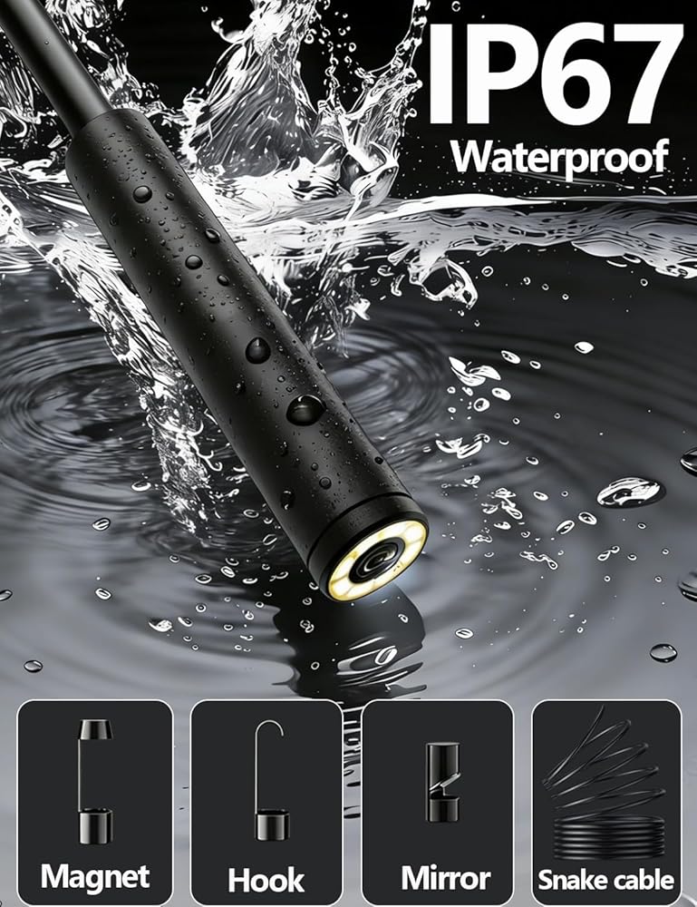 【5.5mm Ultra-Slim Probe + IP67 Waterproof】 The 5.5mm ultra-rigid probe effortlessly navigates narrow gaps in car engines, AC ducts, water pipes, and other areas inaccessible to standard endoscopes. IP67 waterproof rating enables use in wet environments like flooded pipes and fuel tanks.