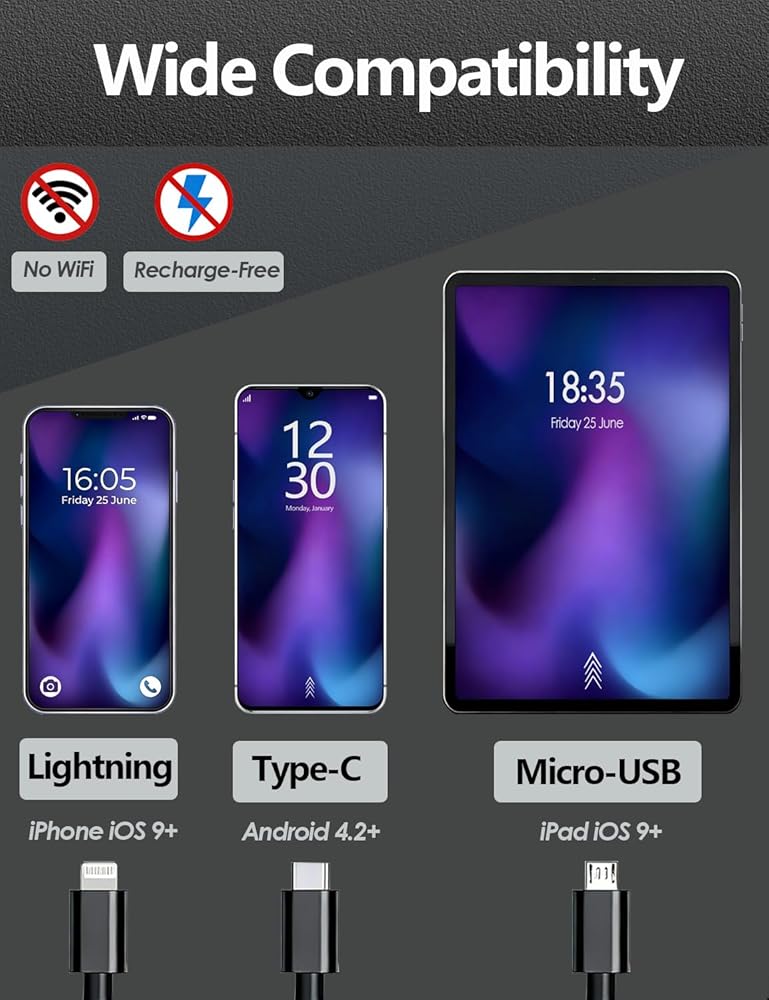 【Wide Compatibility, Plug-and-Play】 Perfectly compatible with iOS/Android phones and iPads—simply download the “Useeplus” app. Plug and play on iPhones; some Android devices only require confirming OTG functionality. The triple-port Type-C, Lightning, and Micro-USB interface works with 99% of devices on the market, eliminating the hassle of carrying extra adapters. Ideal for DIY enthusiasts, professional mechanics, and HVAC technicians needing instant access to hidden spaces.