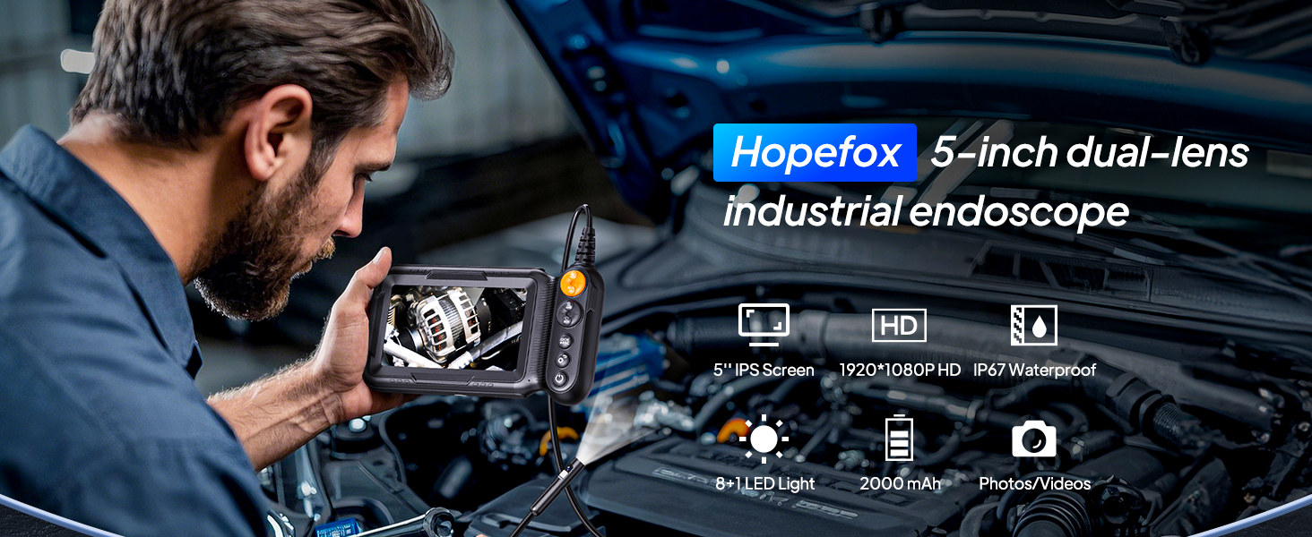 【5-Inch Digital Endoscope】Equipped with a 5-inch IPS display, this endoscope delivers sharp, vibrant visuals with a 1920×1080P resolution and a 170° horizontal viewing angle. Powered by a built-in 2000mAh rechargeable battery, it ensures extended usage and can be used immediately after charging—no need for additional apps or Wi-Fi connections. Perfect for convenience and practicality, this inspection camera makes an excellent gift. Note: An SD card is not included; please prepare one for capturing photos and videos