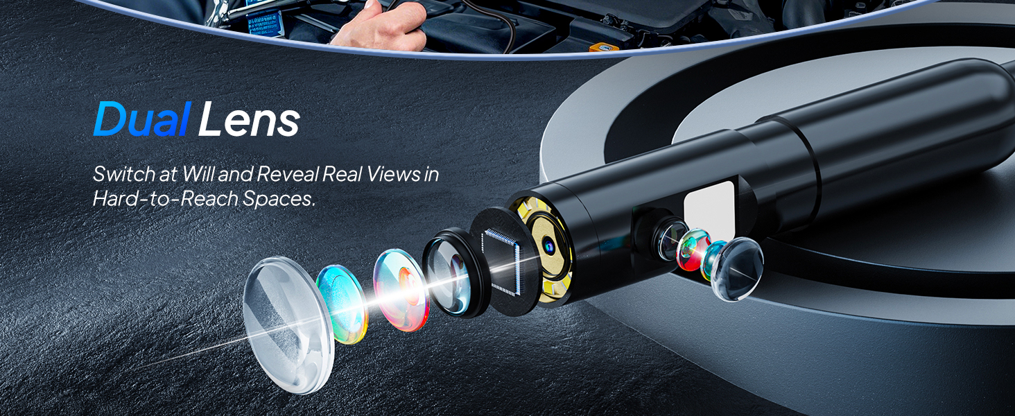 【Dual-Lens Endoscope Camera with Light】Featuring a dual-lens design, this borescope camera enhances visibility, flexibility, and precision during inspections. The main lens offers an optimal focal range of 2–10 cm, while the side lens focuses best between 2–4 cm. Please note that the camera does not support autofocus, so manual adjustment of the distance between the camera and the target is required for the clearest image