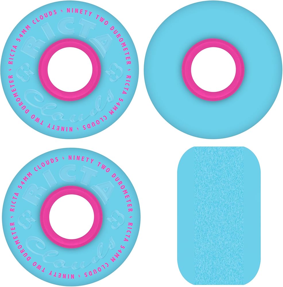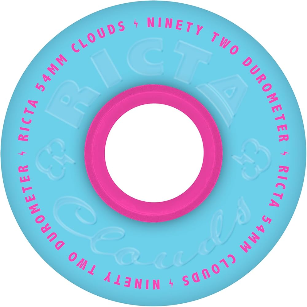 The Ricta Clouds Blue Pink 54mm, 92a wheels feature light blue urethane and pink core, with debossed and pad printed lettering on our soft yet firm 92a urethane: perfect for filmer setups or skating rougher terrains.