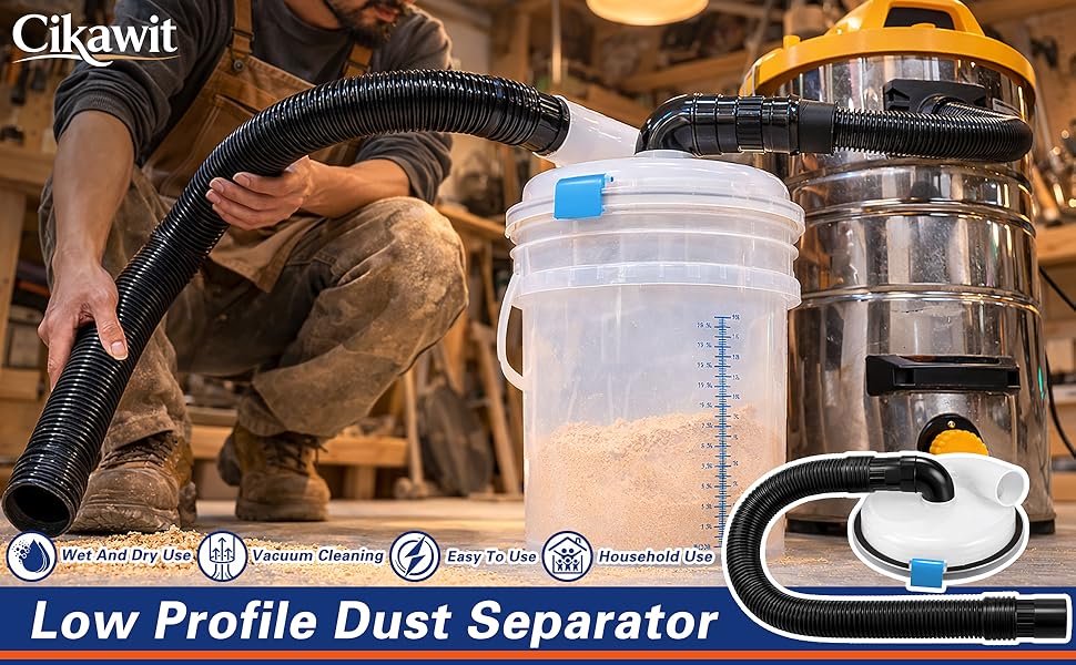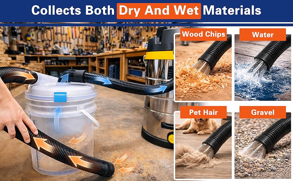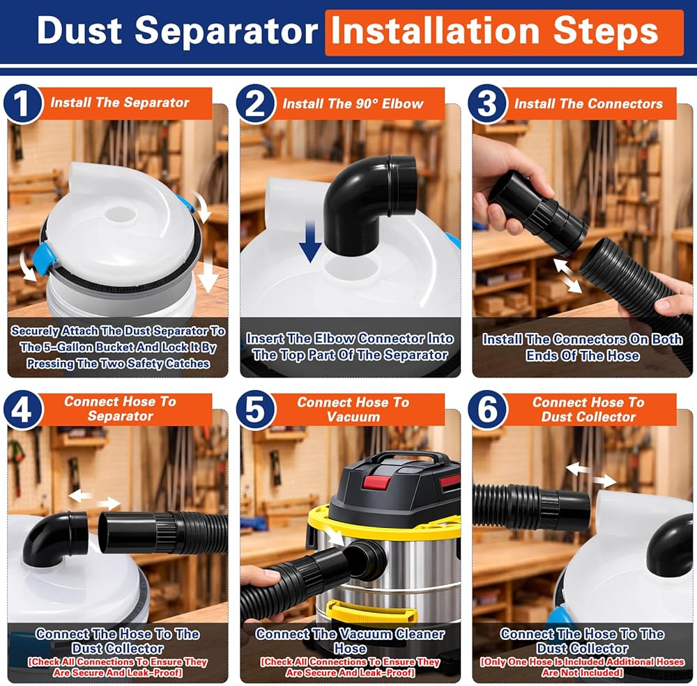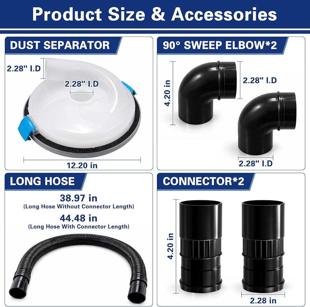 Complete Dust Collection Kit -Made from durable, high-quality materials, this kit includes everything needed for quick setup: 1 low-profile dust separator, 2 × 90-degree elbows, 2 × connectors, and 1 × 2-1/2-inch hose. It's compatible with most wet/dry vacuums and can handle a wide range of debris types, from wood dust and drywall to wet materials and pet hair.