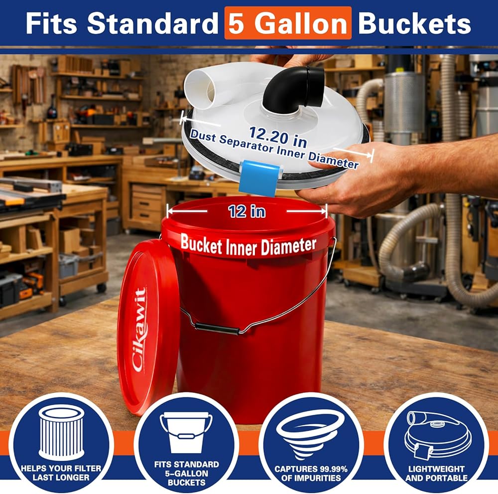 Leak-Resistant Design with Minimal Setup - This dust separator comes with a pre-installed thickened gasket, providing a tight, leak-resistant seal with standard 5-gallon buckets. No complicated assembly or setup is needed—just place the lid on the bucket and start using it right away! Enjoy a hassle-free, secure seal without worrying about air leaks.