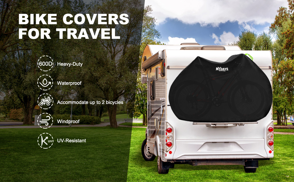 [UNIVERSAL VEHICLE COMPATIBILITY] Ideal for RVs & SUVs Whether you're heading cross-country in an RV or heading to the trail in an SUV or Truck, our cover is designed to fit. It's compatible with a wide range of bikes, including E-bikes, MTBs, and fat-tire cruisers, ensuring your gear arrives clean and ready to ride.