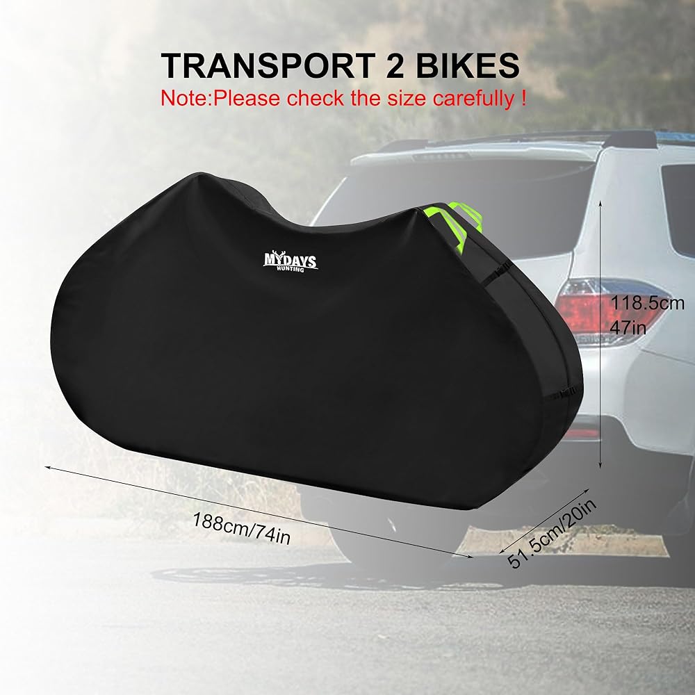 MYDAYS Bike Cover for 2 Bikes on Hitch Rack - Waterproof 600D Oxford Transport Cover for SUV, RV & Truck - Windproof Bicycle Carrier Cover with Buckles & Storage Bag - Travel Shield for E-Bikes & MTB