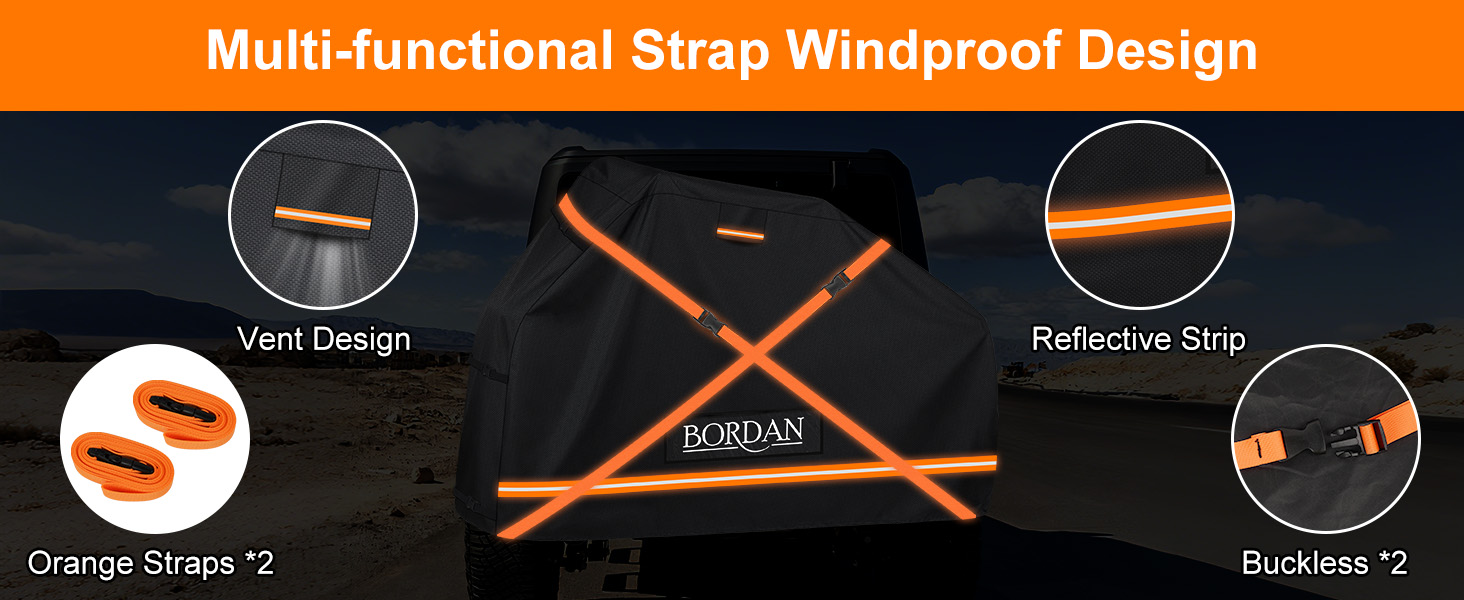 Multi-functional strap design: The bike rack cover comes with two 3-meter elastic safety straps, offering multiple securing methods for your bicycle. The orange color enhances visibility and safety. Additionally, the cover features high-visibility orange reflective strips to alert vehicles behind to maintain a safe distance.