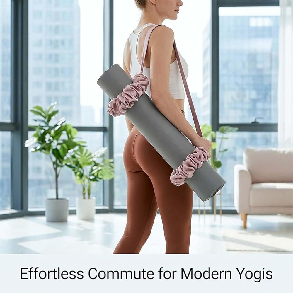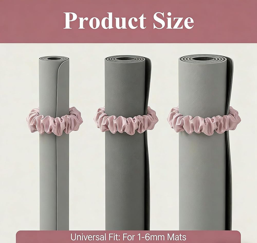 Universal Fit: Includes 2 yoga mat scrunchies (mat not included). It securely holds your mat and doubles as a versatile yoga accessory. Made with flexible, non‑slip fabric that hugs your mat gently without damaging it. Ideal for all standard yoga, Pilates, and stretching mats. *Please do not purchase if your yoga mat is not slim.