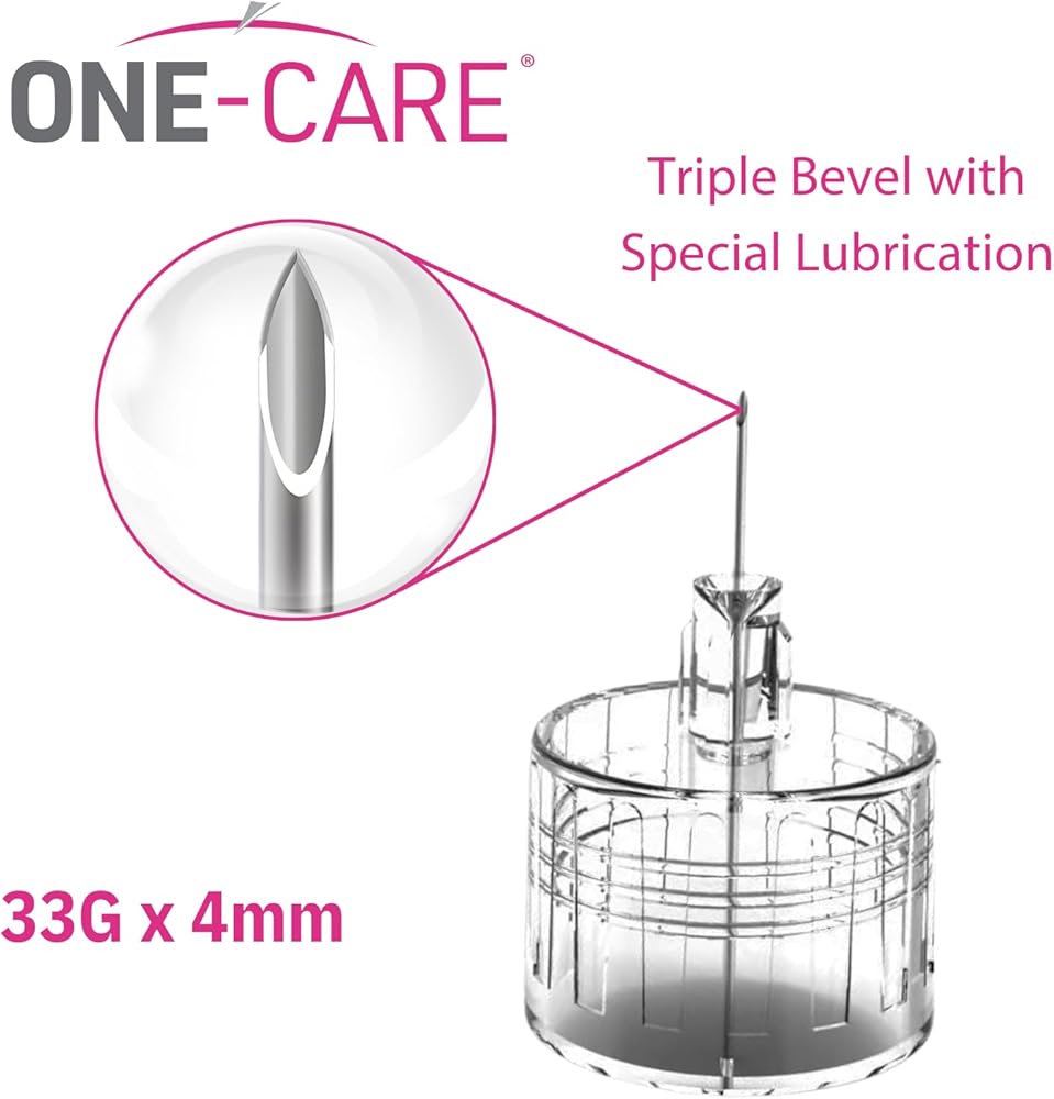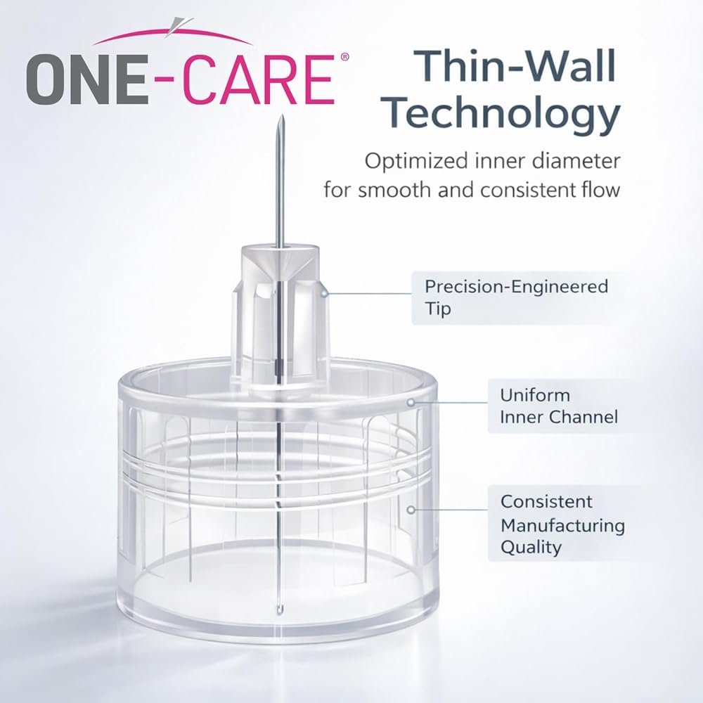 ONE-CARE Pen Tips 33G x 4 mm (5/32”) are designed with a compact, ultra-fine format and consistent dimensional specifications for use with compatible pen-type devices. The 33 gauge tip and short 4 mm length provide a low-profile configuration suitable for everyday handling. The thin-wall channel structure features an optimized internal geometry that supports consistent liquid passage while maintaining structural integrity. Each tip is manufactured using a precision finishing process and treated with a surface coating to ensure uniformity across units. A threaded twist-on connection is designed to fit most standard pen-type systems, allowing for stable attachment during use. Each pen tip is individually sealed and supplied in a compact box containing 100 pieces for organized storage and handling. Packaging appearance may vary.