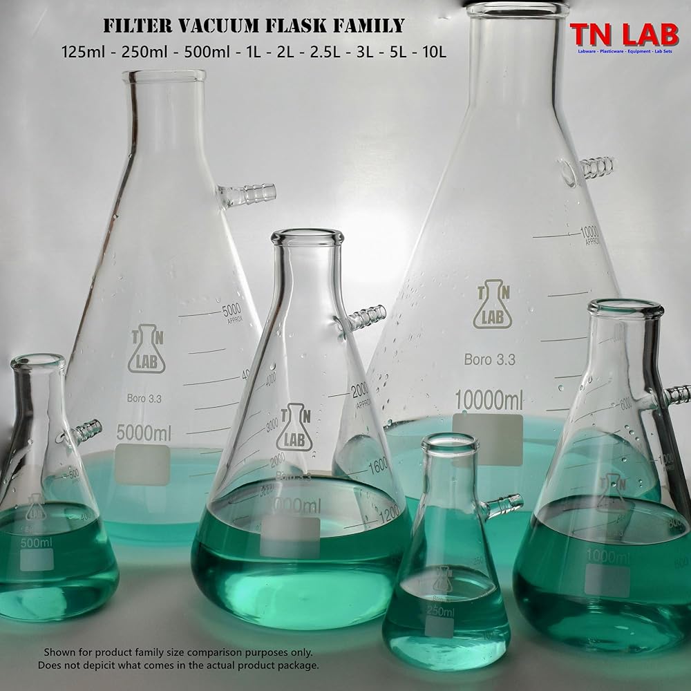 TN Lab Supply Heavy-Wall Conical Borosilicate 3.3 Glass 2,500ml 2.5L Filter Flask. Also known as vacuum flasks or Büchner flasks, have heavier walls than a standard conical flask to endure effects of vacuum filtration. Side arm with barb allows for flexible hosing to connect to a vacuum pump. During filtration, the filtrate enters and is held in the flask while the sample or residue remains on the filter paper in the funnel. Can also be used as a vacuum trap in a vacuum line. Highly leach resistant to most chemicals.