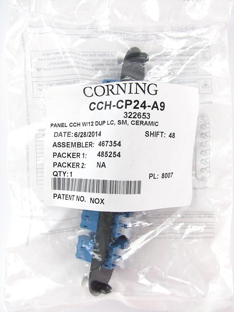 Corning Closet Connector Housing (CCH) Panel, LC Adapters Duplex, UPC, 24 F, Single-mode (OS2) Corning Part Number: CCH-CP24-A9 Corning Cable Systems Closet Connector Housing Panels (CCH-CP) are offered in a variety of fiber counts for use with LANscape Solutions hardware products for a “one-size-fits-all” approach. Used with factory-installed or field-installable connectors, these panels provide interconnect or cross-connect capability in a housing at main cross-connects, intermediate cross-connects, telecommunication rooms or work areas. Available with a variety of industry-standard adapter types, the CCH-CP provides an efficient way to securely mate two connectors and offers multimode and single-mode applications.