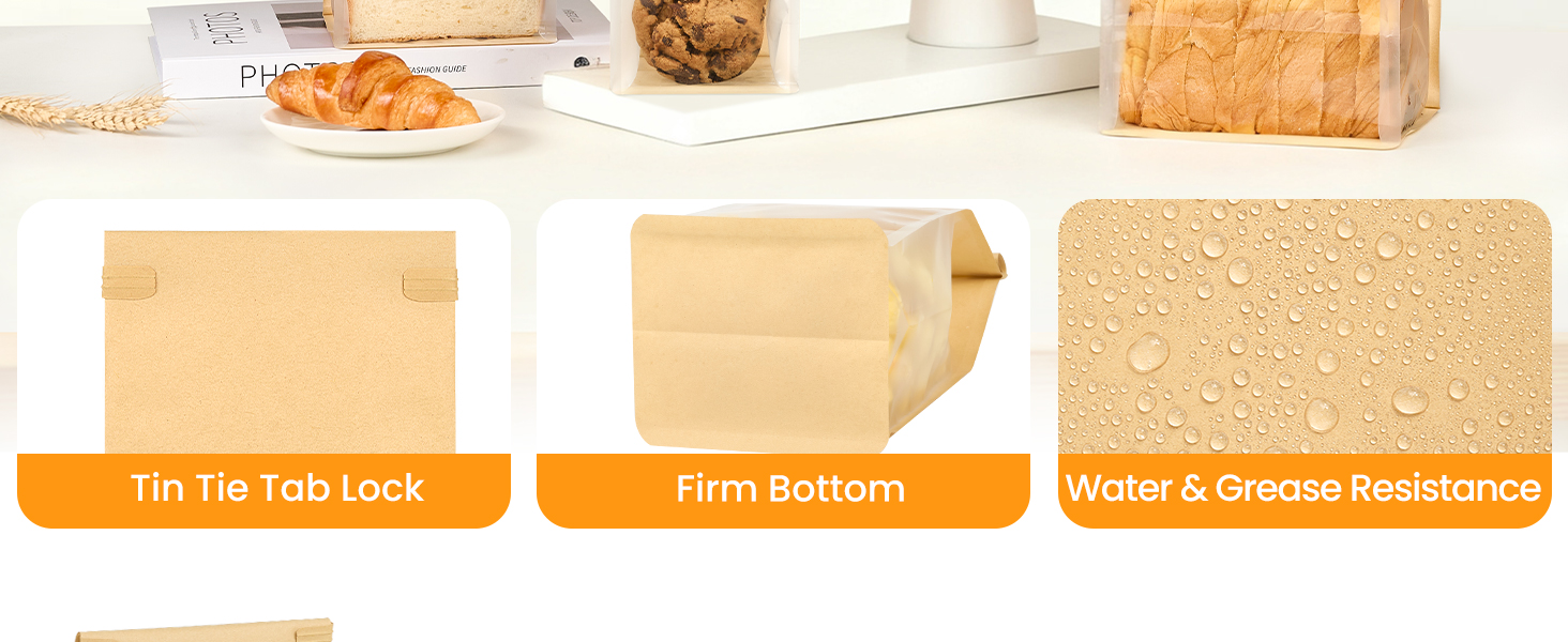 Tin Tie Tab Lock: Bakery bags feature tin tie tab locks, eliminating the need for tape or stickers and making them can be opened or closed repeatedly, providing a good seal that keep food fresh and clean