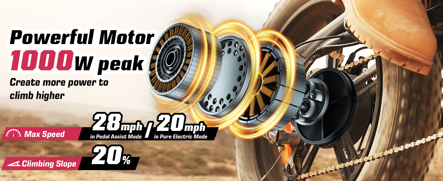 【Powerful Motor for Ultimate Performance】The E2 eBike is equipped with a 1000W peak brushless hub motor, delivering unmatched power for all terrains. Reach speeds of up to 28 MPH in Pedal Assist Mode / 20 MPH in Pure Electric Mode (comply with the regulations of electric bicycle classification 3) and conquer steep hills with ease, including inclines up to 20% gradient. Perfect for casual rides or off-road challenges, this motor ensures a smooth and powerful ride every time.
