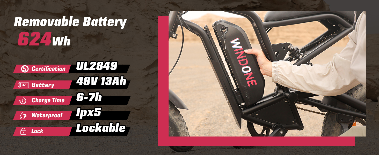 【Long-Lasting 624Wh Removable Battery with UL Certification】Stay powered up with the E2's 48V/13Ah removable battery, featuring UL2849 certification for safety and durability. With an IPX5 waterproof rating, it's built to handle light rain (though heavy rain is not recommended). Enjoy a full charge in just 6-7 hours, and always use the included original charger to protect your battery's lifespan. (Passed UL 2849 certification and the testing laboratory is UL LLC.)