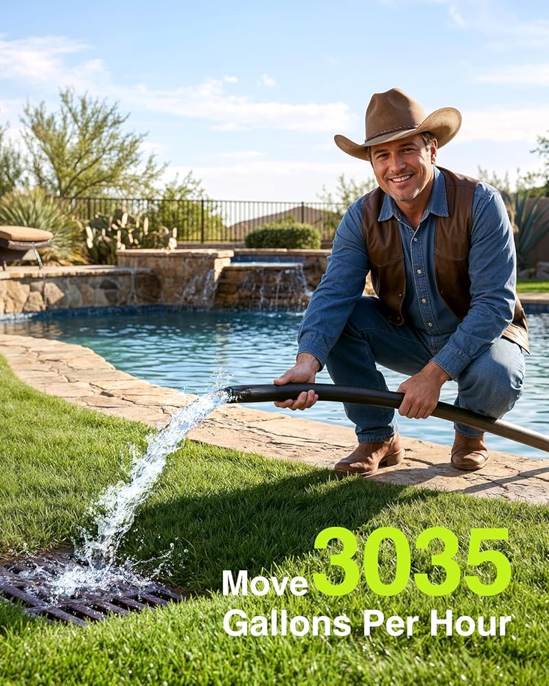 POWERFUL 1/3 HP MOTOR & 3035 GPH HIGH FLOW: Engineered with a heavy-duty 1/3 HP copper motor, this submersible utility pump delivers a massive flow rate of 3035 GPH, moving up to 50 gallons of water per minute. It effortlessly tackles heavy tasks, rapidly draining standing water from large inground pool covers, flooded basements, and garden ponds to prevent structural damage and stagnation.