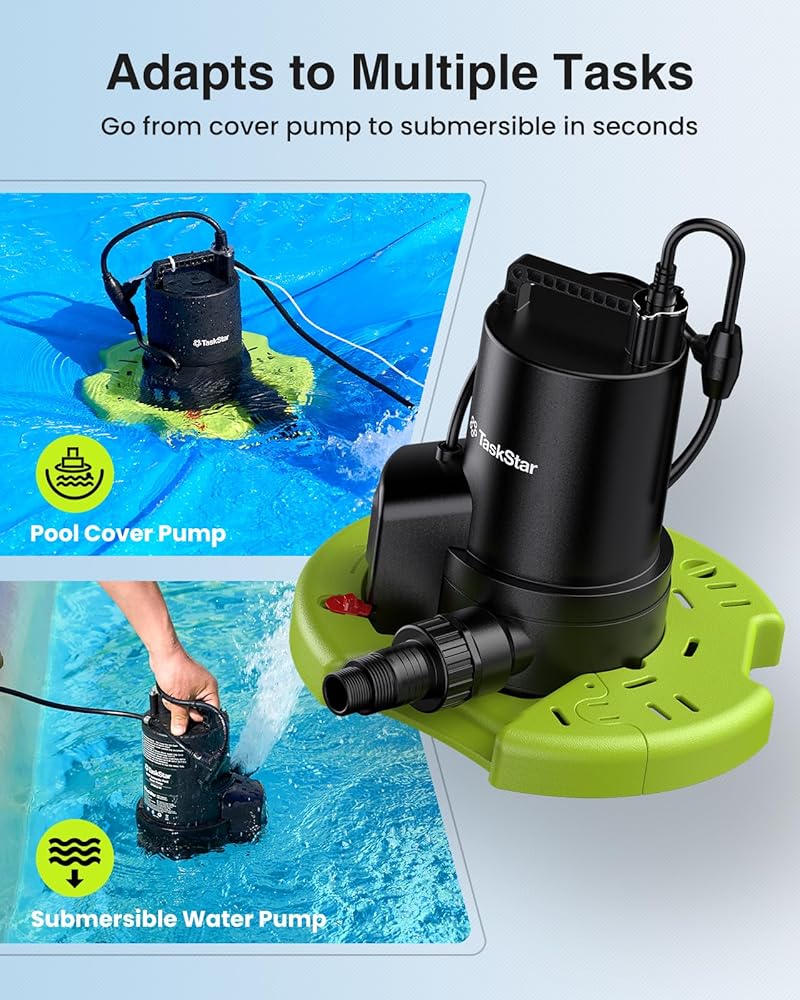 2-IN-1 CONVERTIBLE BASE FOR MULTI-SCENE USE: Features a unique detachable strainer base that transforms the unit from a stable pool cover drainer into a standard submersible water pump in seconds. This versatile design allows you to clear water from hot tubs, window wells, rooftops, and boat bilges, making it an essential all-season household water removal tool.
