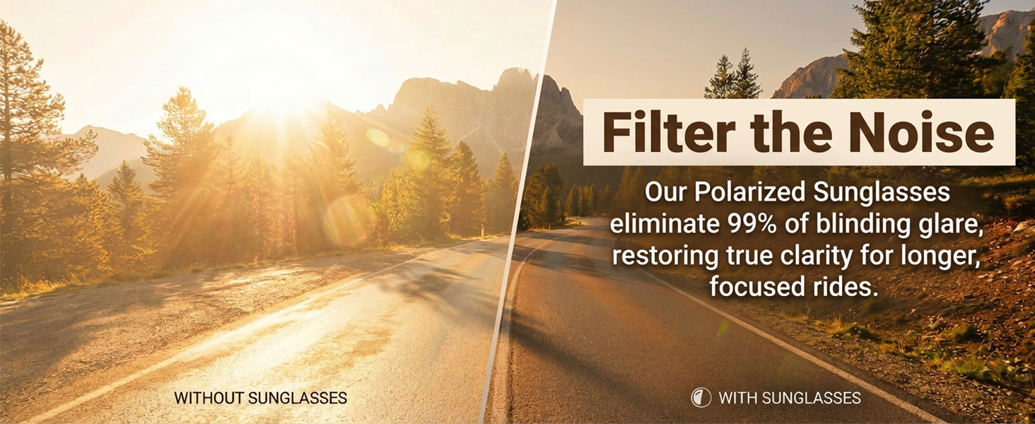 【HD Polarized & 99.99% UV Protection】 Engineered with high-definition polarized lenses to eliminate 99.9% of reflected glare from surfaces like roads and water, restoring true color and sharpening contrast. These glasses provide 99.99% UVA/UVB protection and feature an impact-resistant, anti-scratch coating to shield your eyes from debris, wind, and insects during high-speed rides.