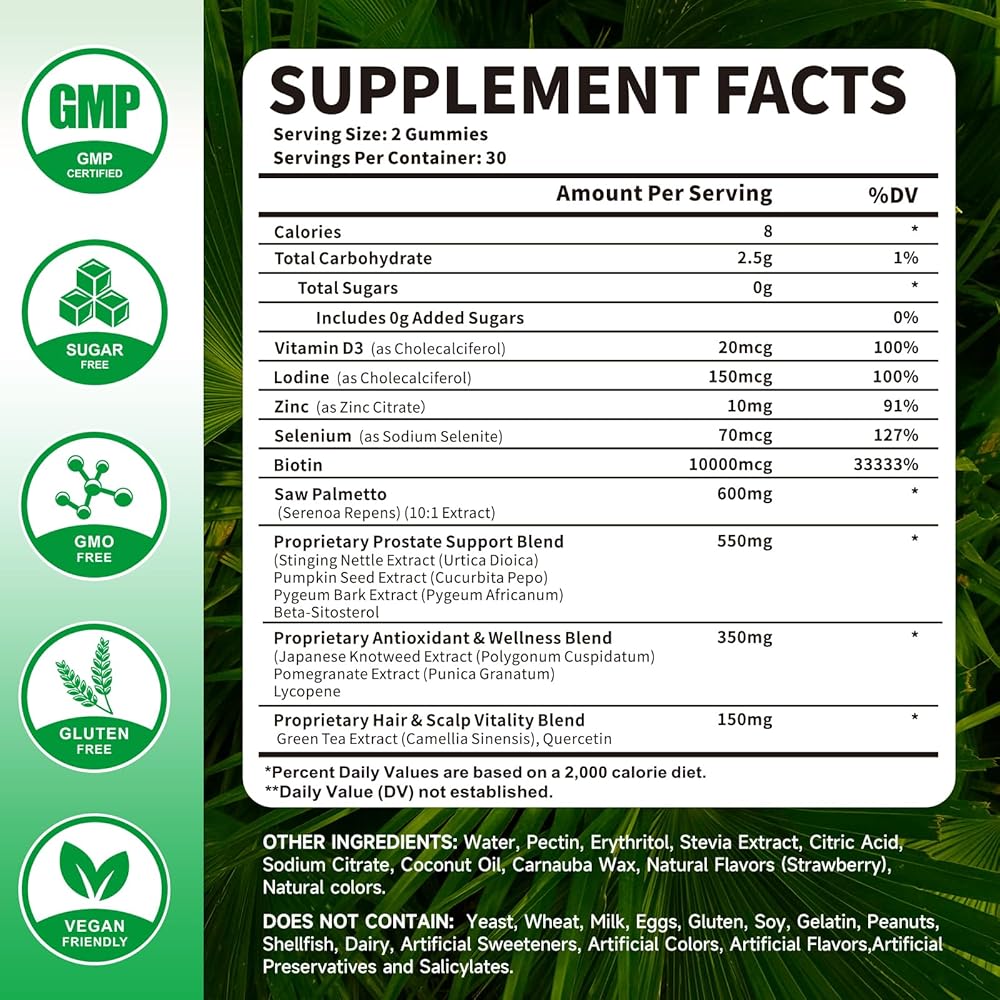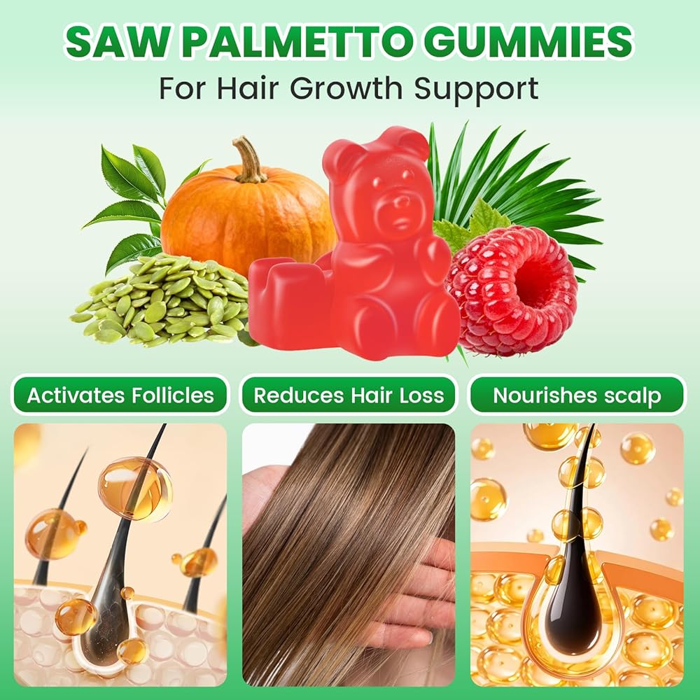 Hair Health Support: Saw palmetto gummies for women & men are formulated to function as a natural DHT blocker. These saw palmetto hair growth supplements are designed to promote scalp health and stimulate the growth of stronger, fuller-looking hair
