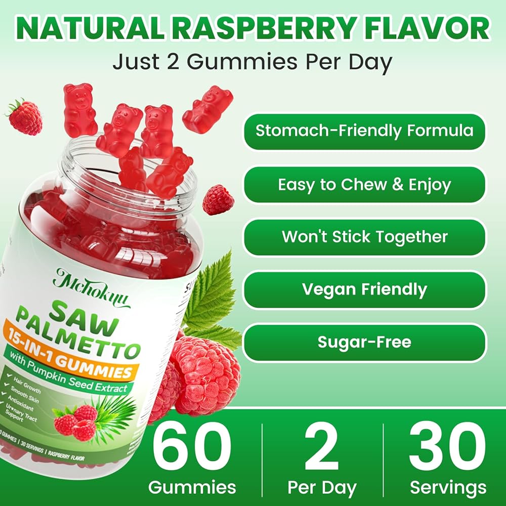 Ideal for Men & Women: Saw palmetto gummies are good for all ages. Don't need water or food to be swallowed, so they're quickly absorbed by the digestive system & gentle on the stomach. Each bottle contains 60 gummies, enough to last for 30 days