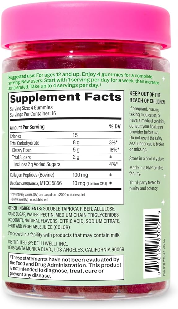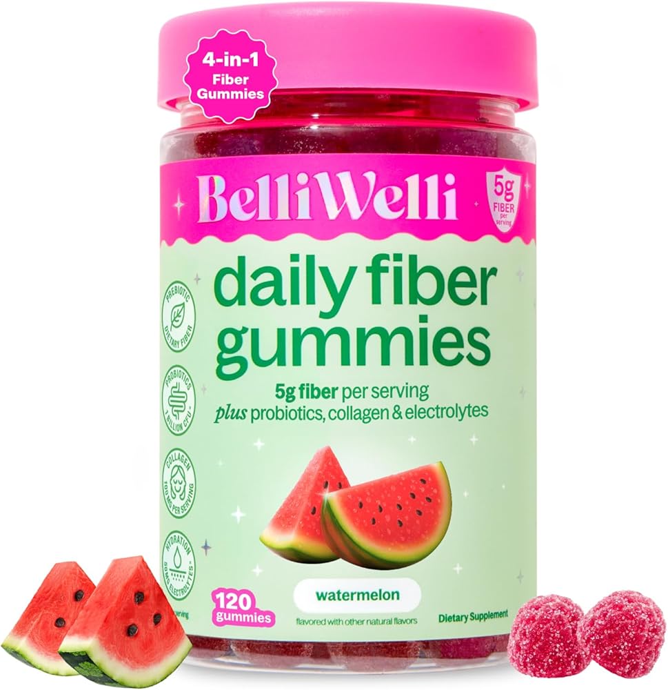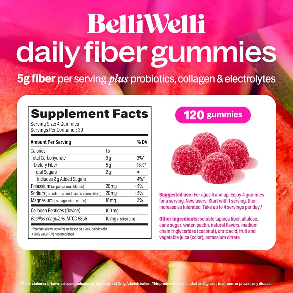 Belli Welli Fiber 4-in-1 Fiber Gummies Supplement with Added Probiotics, Collagen and Electrolytes for Regularity and Bloat Relief, Watermelon, 120 Count