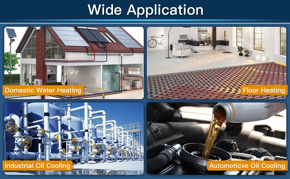 【APPLICATION】Provides the highest level of thermal efficiency and durability in a compact lightweight unit, this water heat exchanger is ideal for domestic water heating, floor heating, snow melting, wort chiller, outdoor wood furnaces, solar heating, zone heating systems, industrial oil cooling, residential and light commercial HVAC hydronic systems.