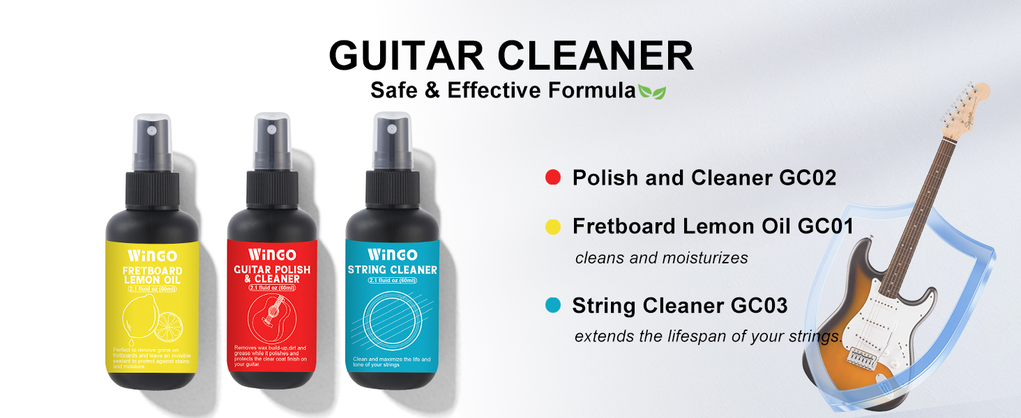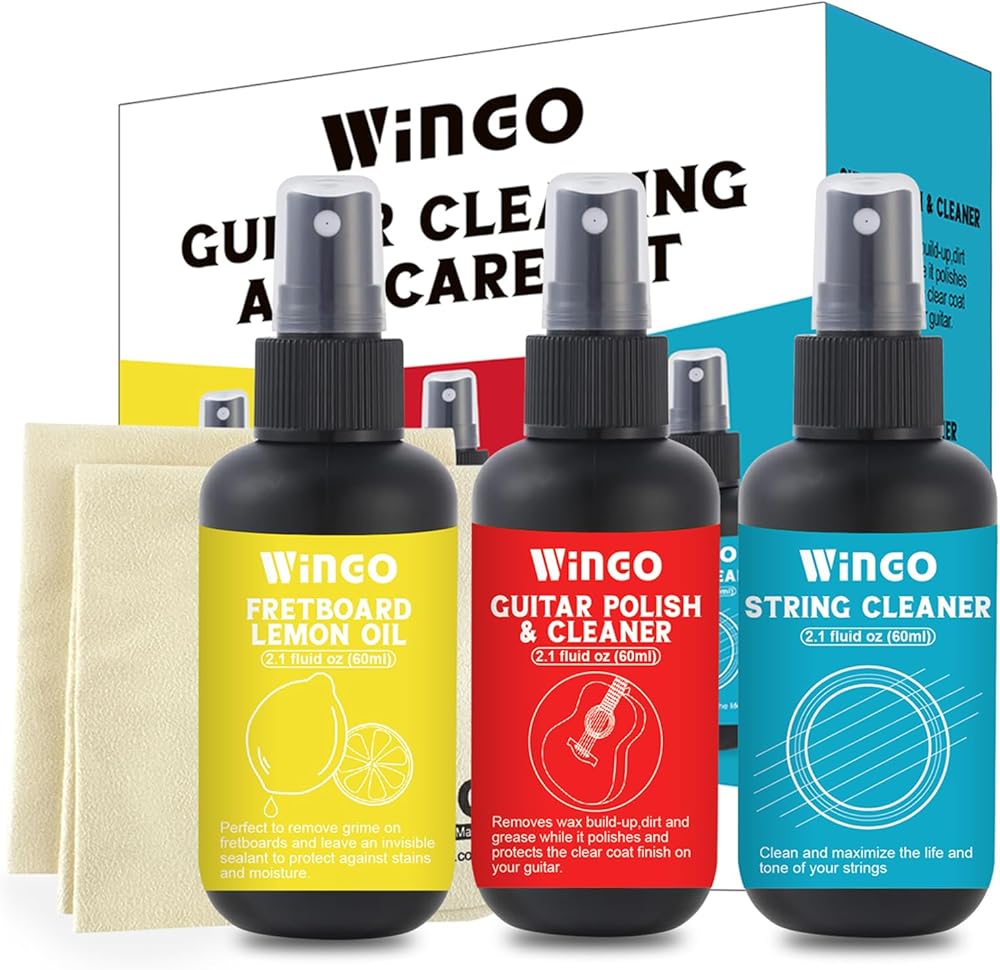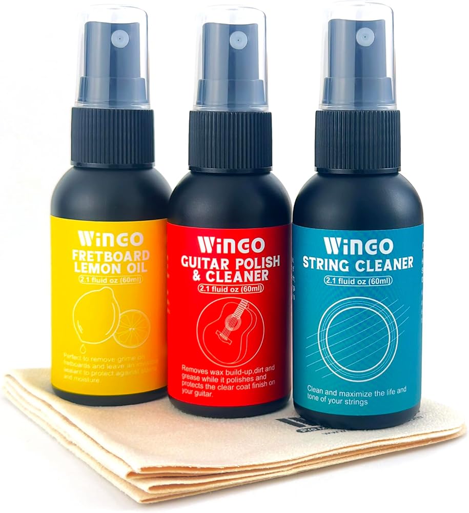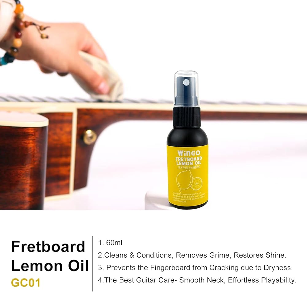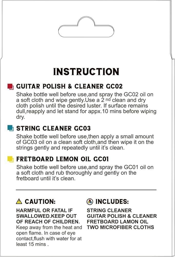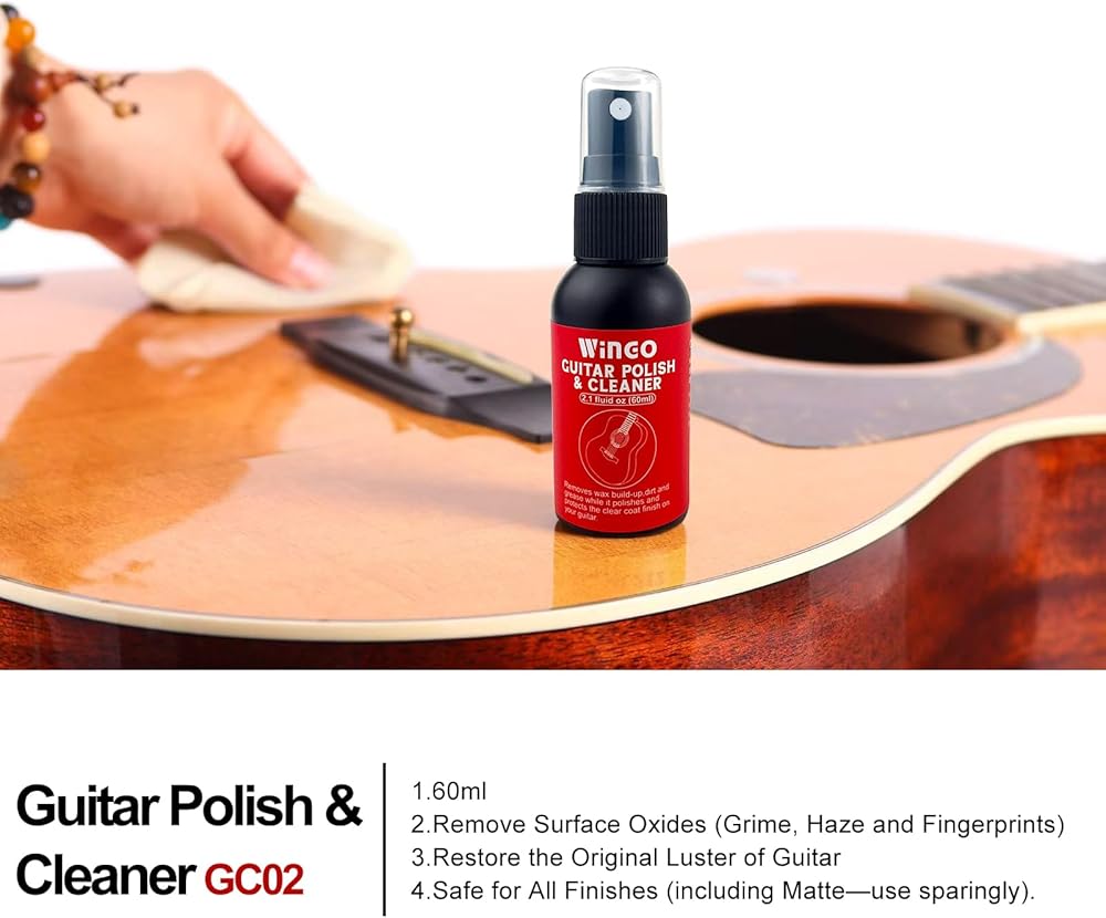 Guitar Cleaning Kit: All the essential components for cleaning, maintaining, and enhancing your instrument. The kit includes 2 x Guitar Cloth for cleaning,1* Polish, 1*Lemon Oil , 1*String Cleaner, 60ml in each bottle.