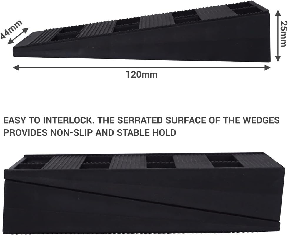 ✔️This 4-pack of black interlocking shims includes wedges measuring 4.72" x 1.73" x 0.98" (120 x 44 x 25 mm) for versatile leveling and installation tasks.