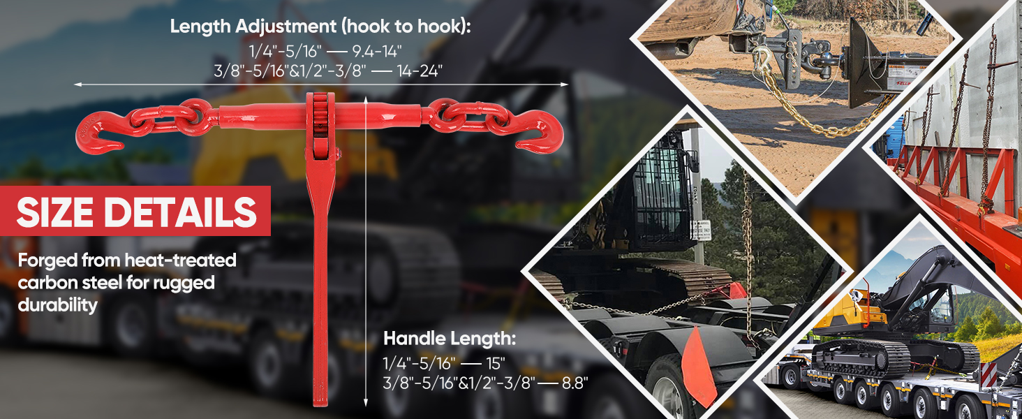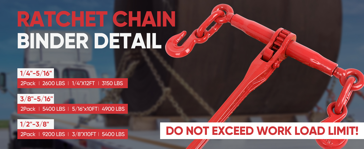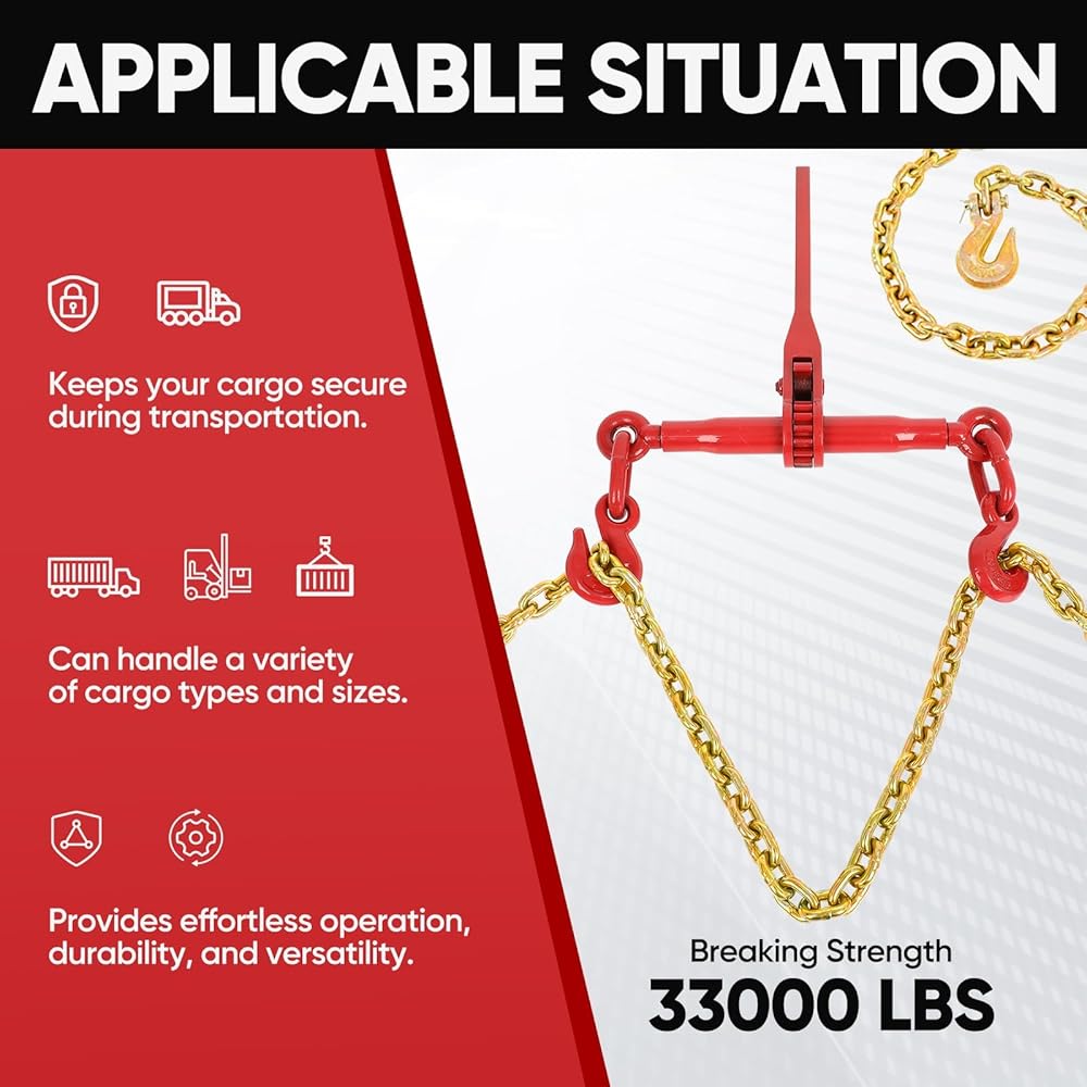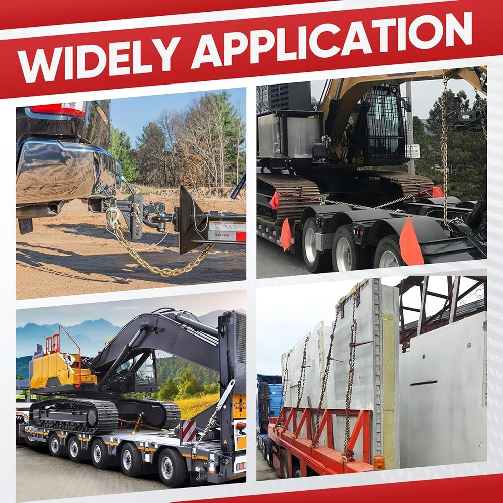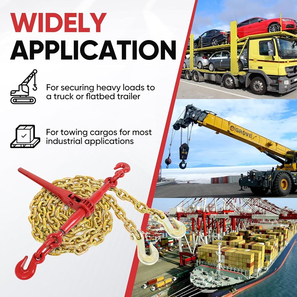 COMPLETE HEAVY-DUTY CHAINS AND BINDERS: This all-in-one chain and binder set provides a full solution for heavy cargo tie down, widely used in commercial trucking, construction and industrial fields, making it a top-choice set of high-performance ratchet binders and chains