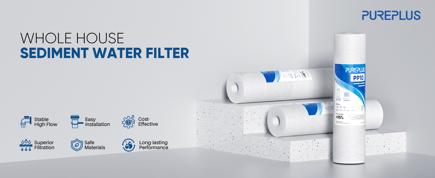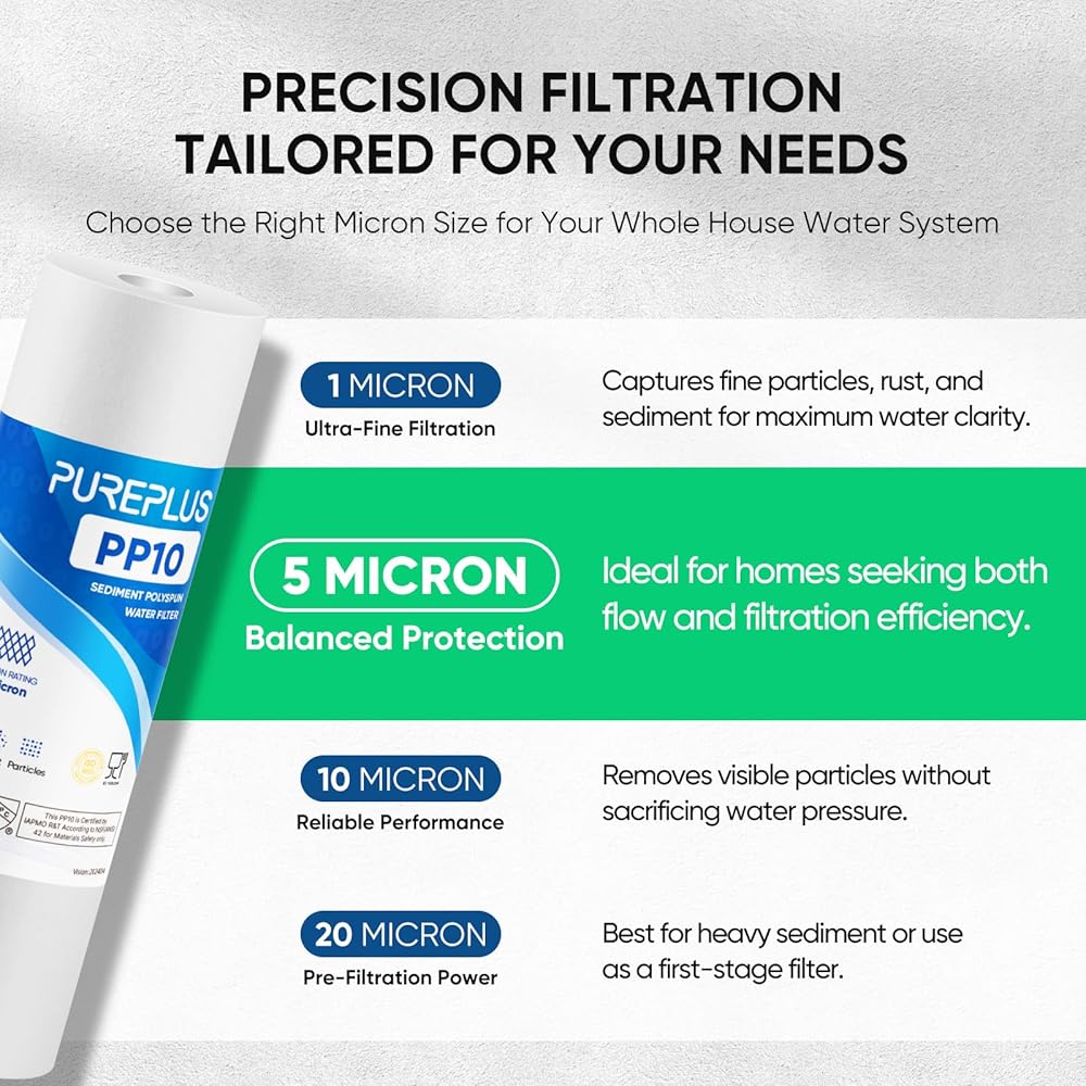 PUREPLUS 5 Micron 10" x 2.5" Whole House Sediment Home Water Filter Cartridge Replacement for Any 10 inch RO Unit, Culligan P5, Aqua-Pure AP110, Dupont WFPFC5002, CFS10, WHKF-G05, 4Pack