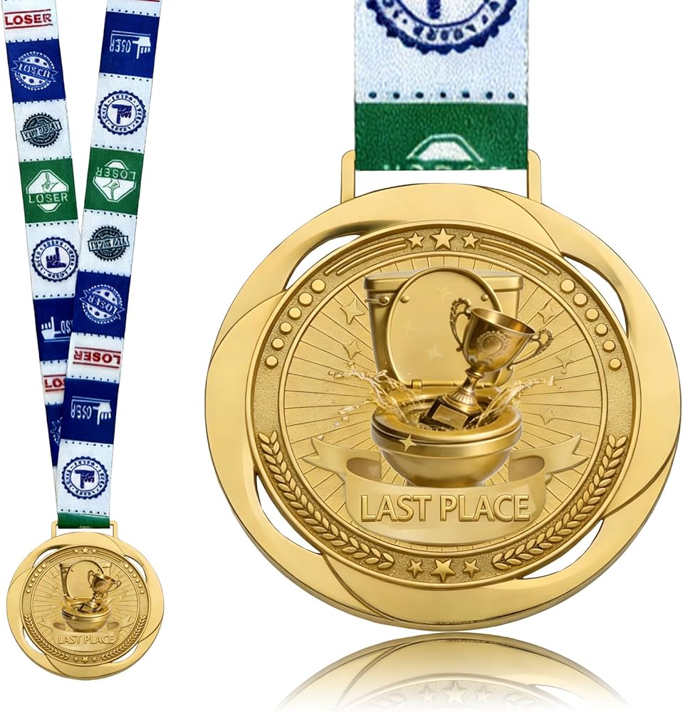HIGH QUALITY MATERIAL: The toilet seat last place medal is made of a sturdy zinc alloy, the toilet seat badge is durable and will hold up well even after rough treatment. The ribbon is made of high-quality polyester, ensuring long-lasting durability and comfort when worn around the neck that looks like toilet paper. Makes a memorable keepsake or gag gift.