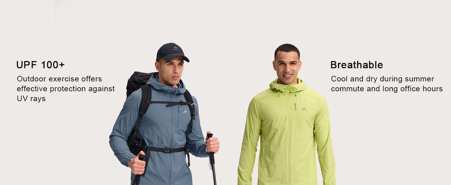 Water-repellent Fabric:Finished with durable DWR coating, this water-resistant packable sun protection jacket effectively repels light rain and morning mist. Ideal for unpredictable outdoor weather while staying lightweight and comfortable