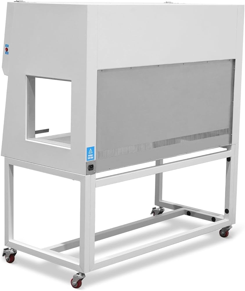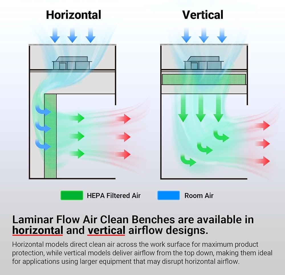 This clean bench has an overall size of H62.4 × W57.5 × D29 in, with an interior workspace measuring H19.7 × W51.2 × D26.8 in and a desktop height of 28.74 in. With vertical airflow, a washable pre-filter, and a HEPA filter, it delivers 99.99% filtration efficiency, compliant with ISO Class 5 (U.S. Fed. Std. 209E Class 100) standards.