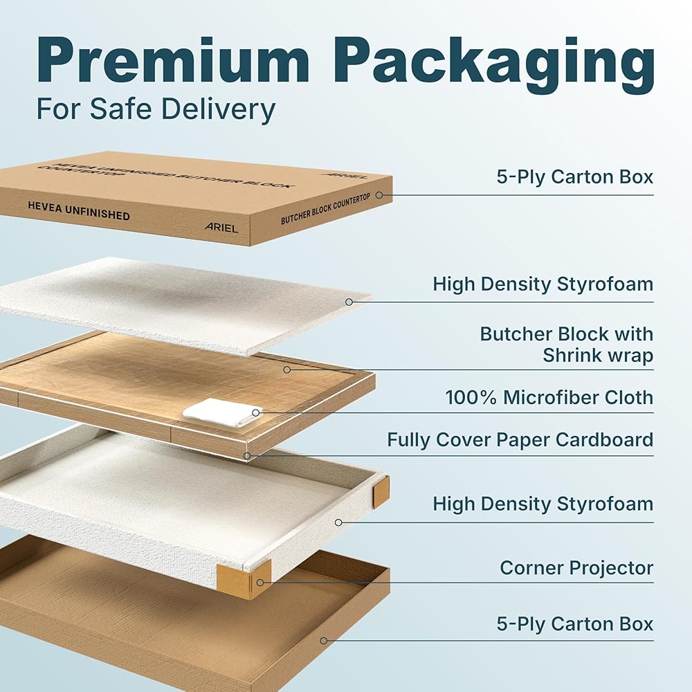 SUPERIOR PACKAGING FOR PROTECTION. Arrives in 4-layer premium packaging to ensure your unfinished butcher block countertop reaches you in pristine condition. Reliable for all projects, from a solid wood desk top to a butcher block island.