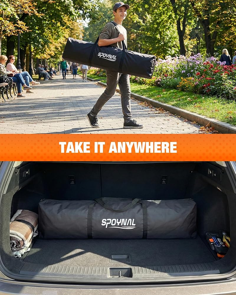 🎒【PORTABLE WITH CARRY BAG】: Your training companion goes where you go. Complete with a convenient carry bag, this soccer goal folds down compactly for easy transport and storage. Take it to the beach, a friend's house, or simply store it neatly in your garage. The included ground stakes ensure secure anchoring on any grass surface.