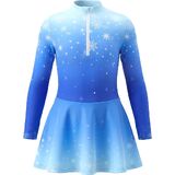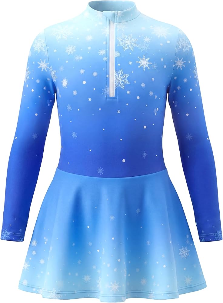 Gradient Snowflake Skating Outfit with Hairband: The beautiful gradient color and delicate snowflake print create a charming figure skating dress look. Long sleeves, mock neck, and a A-line skirt move gracefully on the ice, while the matching headband completes the outfit