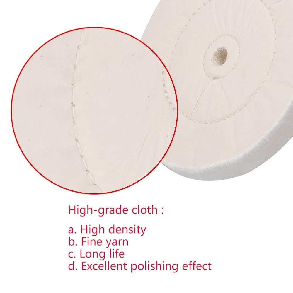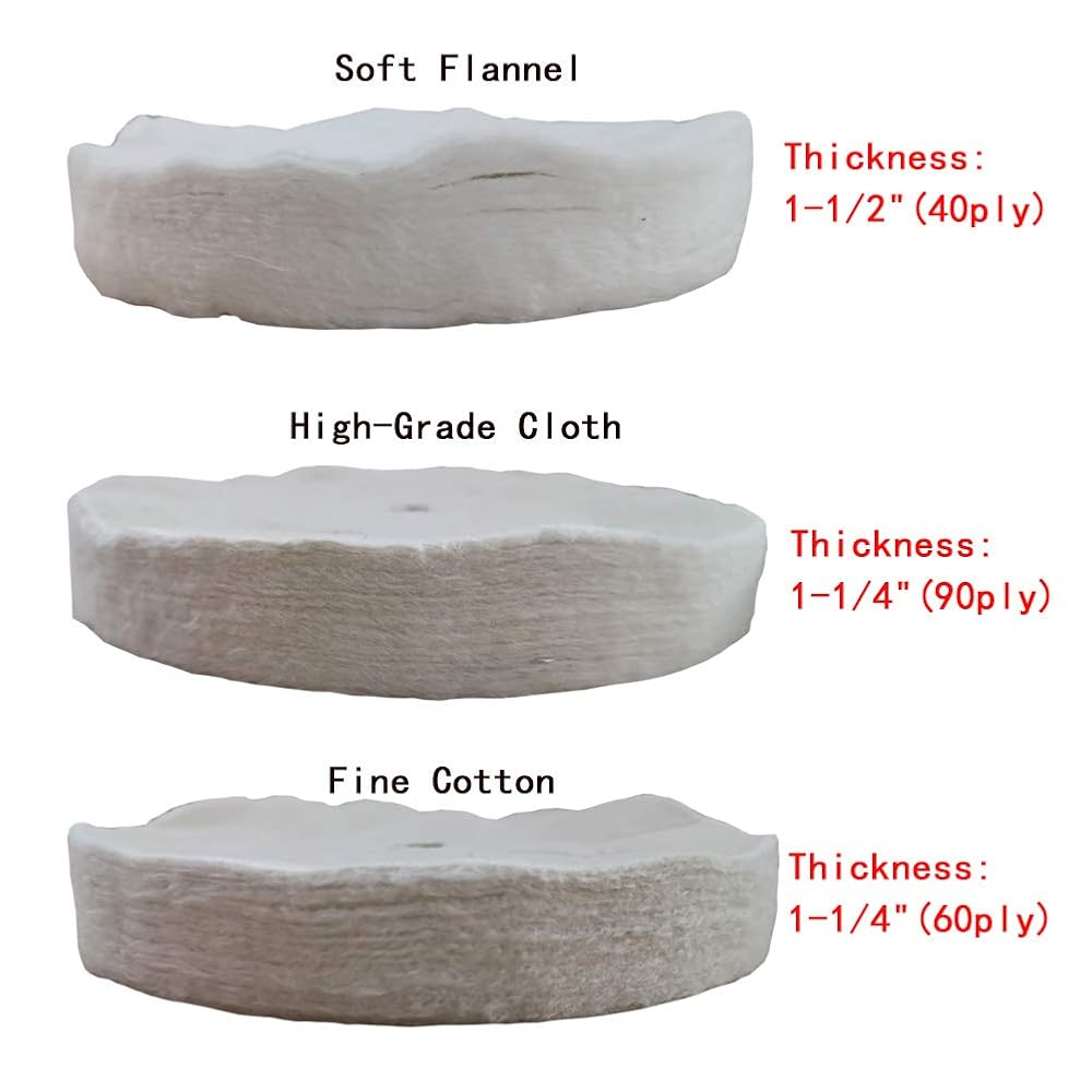 【Dimension】Dia x Arbor hole: 8" x 3/4"; white fine cotton wheel thick: 1-1/4"(60ply), warp/weft: 86/73; soft flannel wheel thick: 1-1/2"(40ply); High-Grade Cloth wheel thick: 1-1/4"(90ply), warp/weft: 133/100. Package: 3pack.