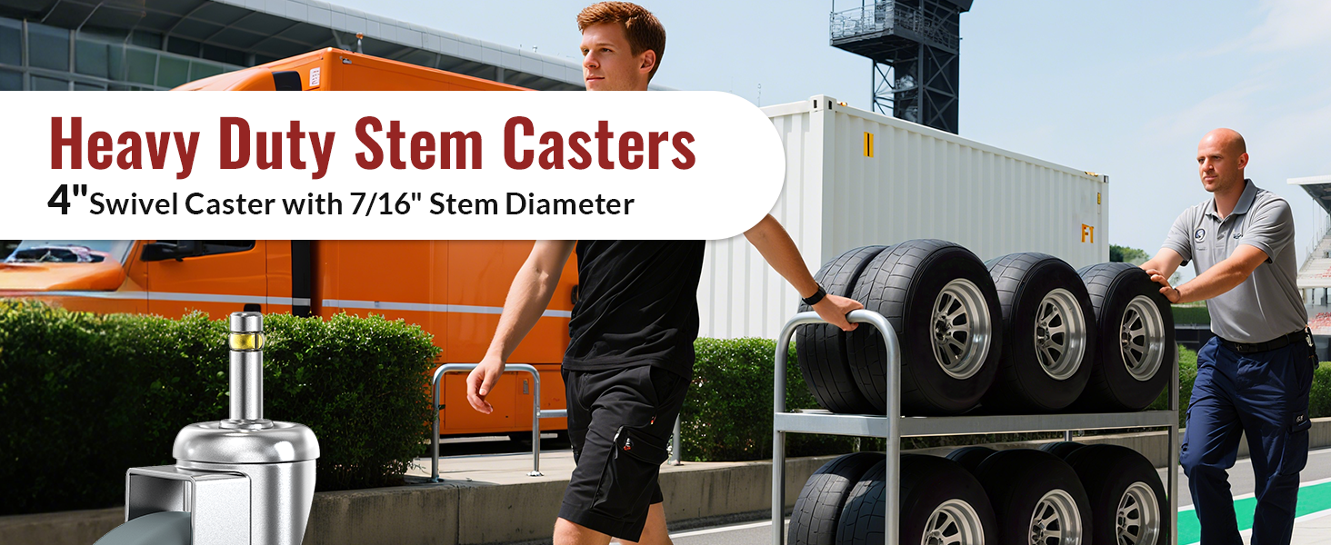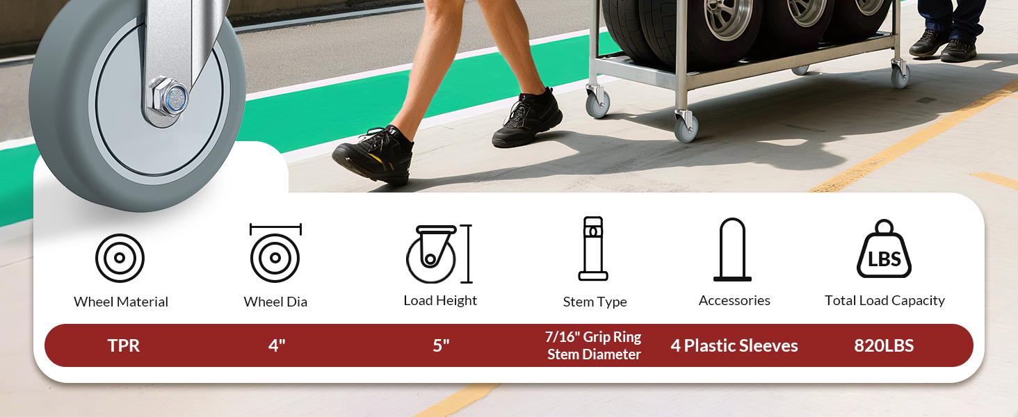 【Easy Installation】4" Swivel Casters, 7/16” x 1-3/8” grip ring stem (Stem Diameter 7/16”, Stem Length 1-3/8”) with upgraded plastic insert sleeves (19/32" outer diameter), allowing quick and secure installation by hand or with a hammer.