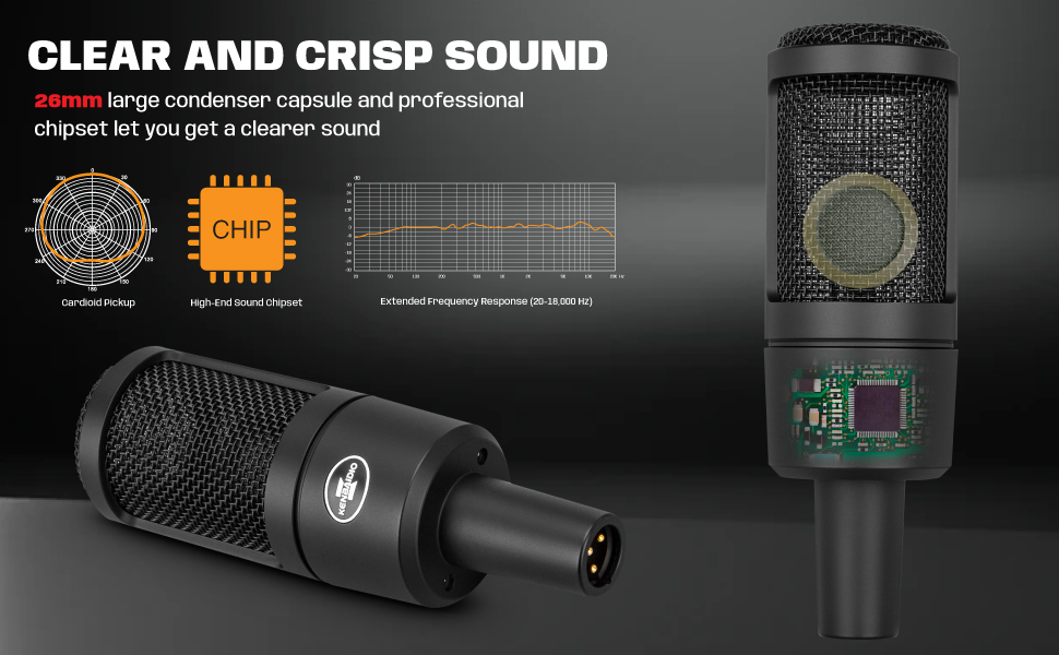 26MM Large Diaphragm Gold Condenser Capsule : The XLR condenser microphone features a custom-designed 26mm large diaphragm condenser capsule and offers a dynamic range of 20Hz - 20kHz, low noise, high sensitivity and extremely high SPL handling provides smooth, high-end clarity, warm and natural sound.Studio recording microphone focuses on podcasting, vocal recording, streaming and content creation.